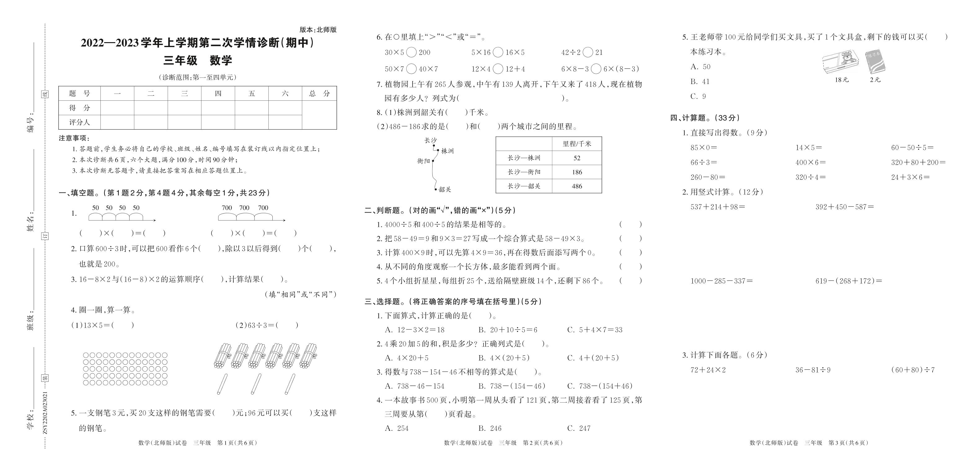 2022—2023学年上学期第二次学情诊断(期中)A卷三年级数学(北师版)