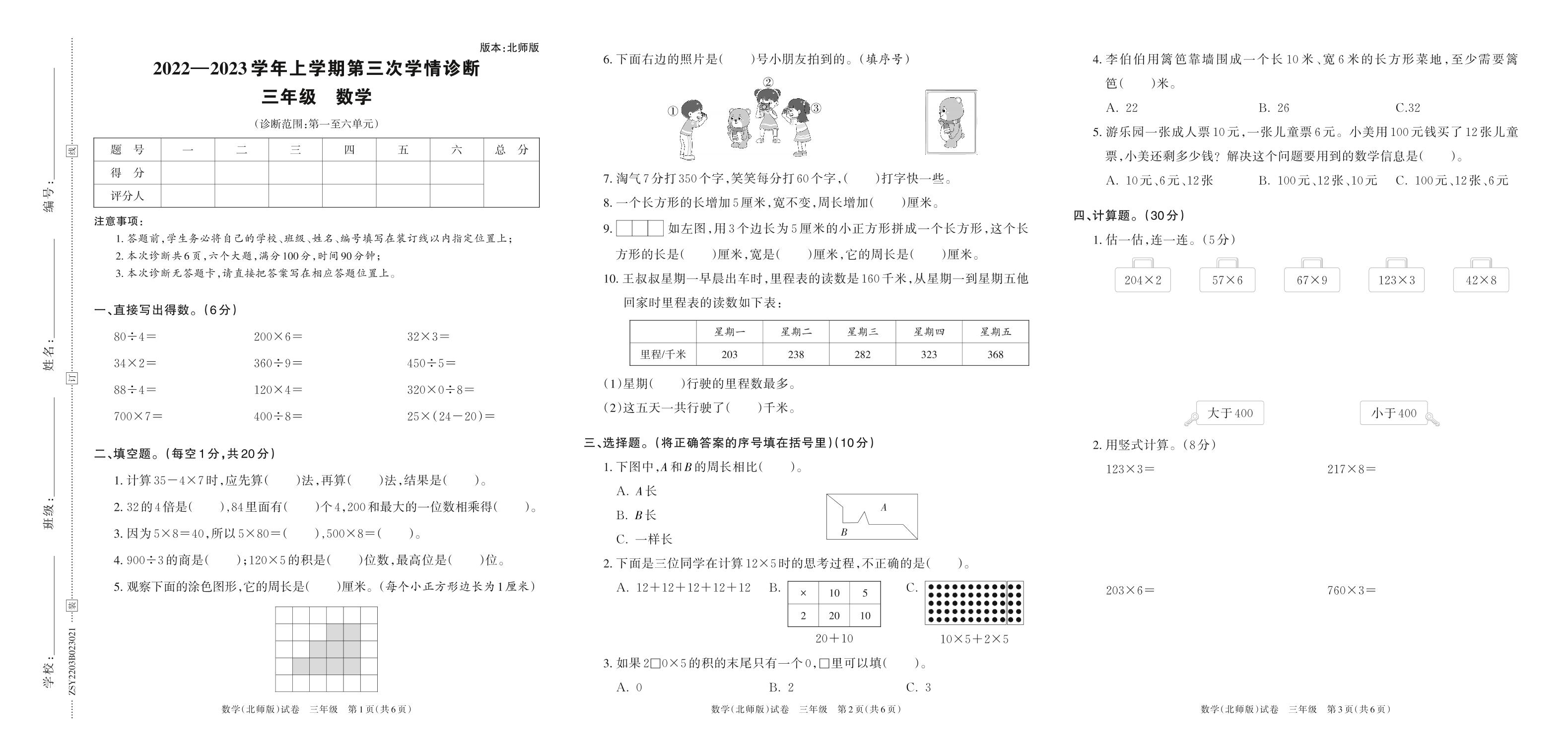 2022—2023学年上学期第三次学情诊断B卷三年级数学(北师版)