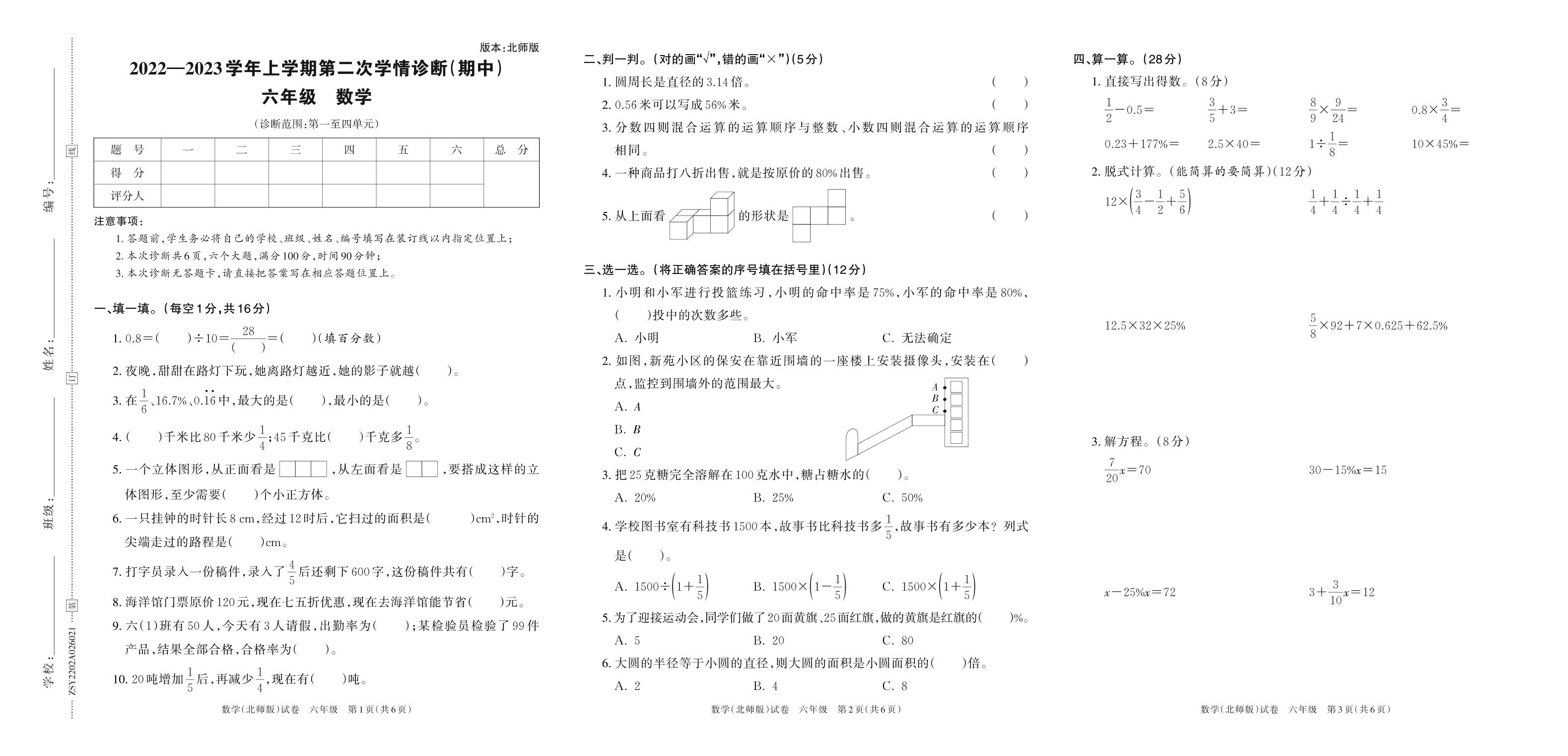 2022—2023学年上学期第二次学情诊断(期中)A卷六年级数学(北师版)