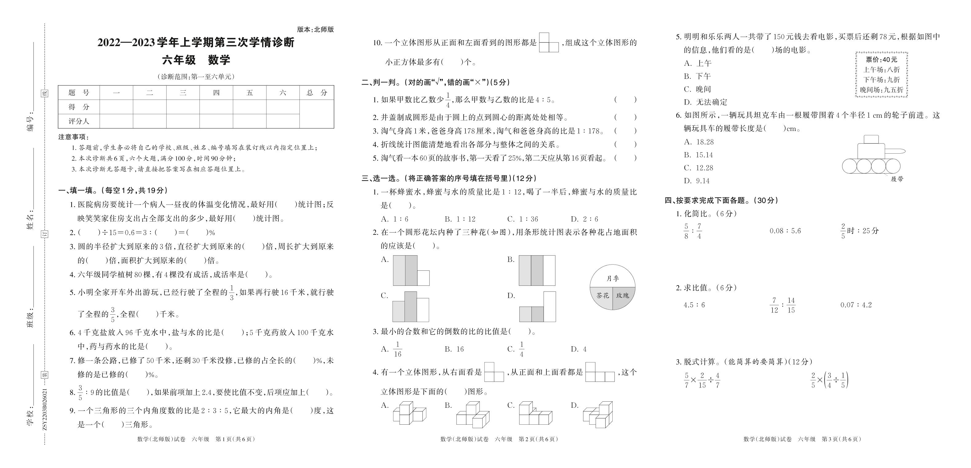 2022—2023学年上学期第三次学情诊断B卷六年级数学(北师版)