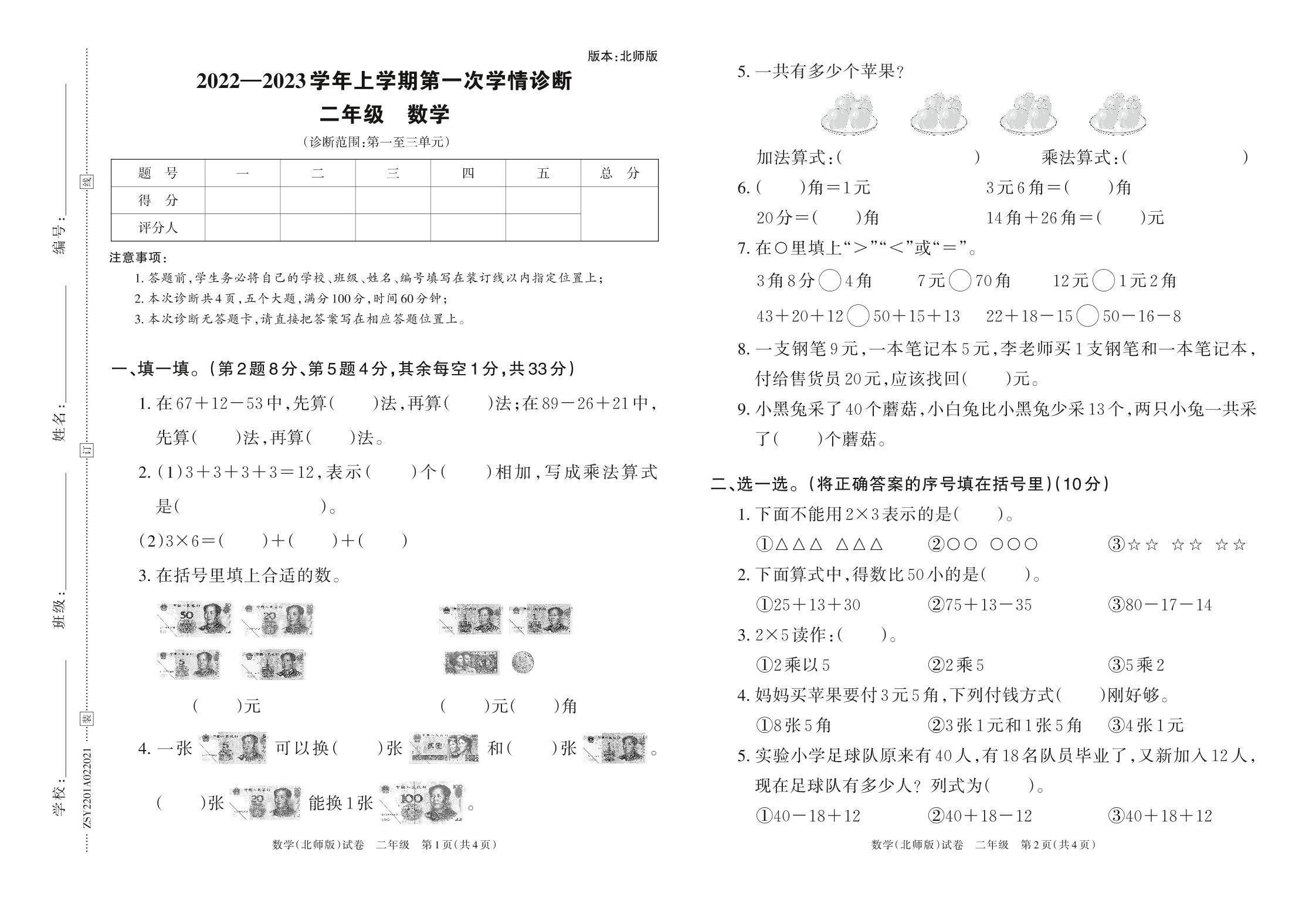 2022—2023学年上学期第一次学情诊断二年级数学(北师版)