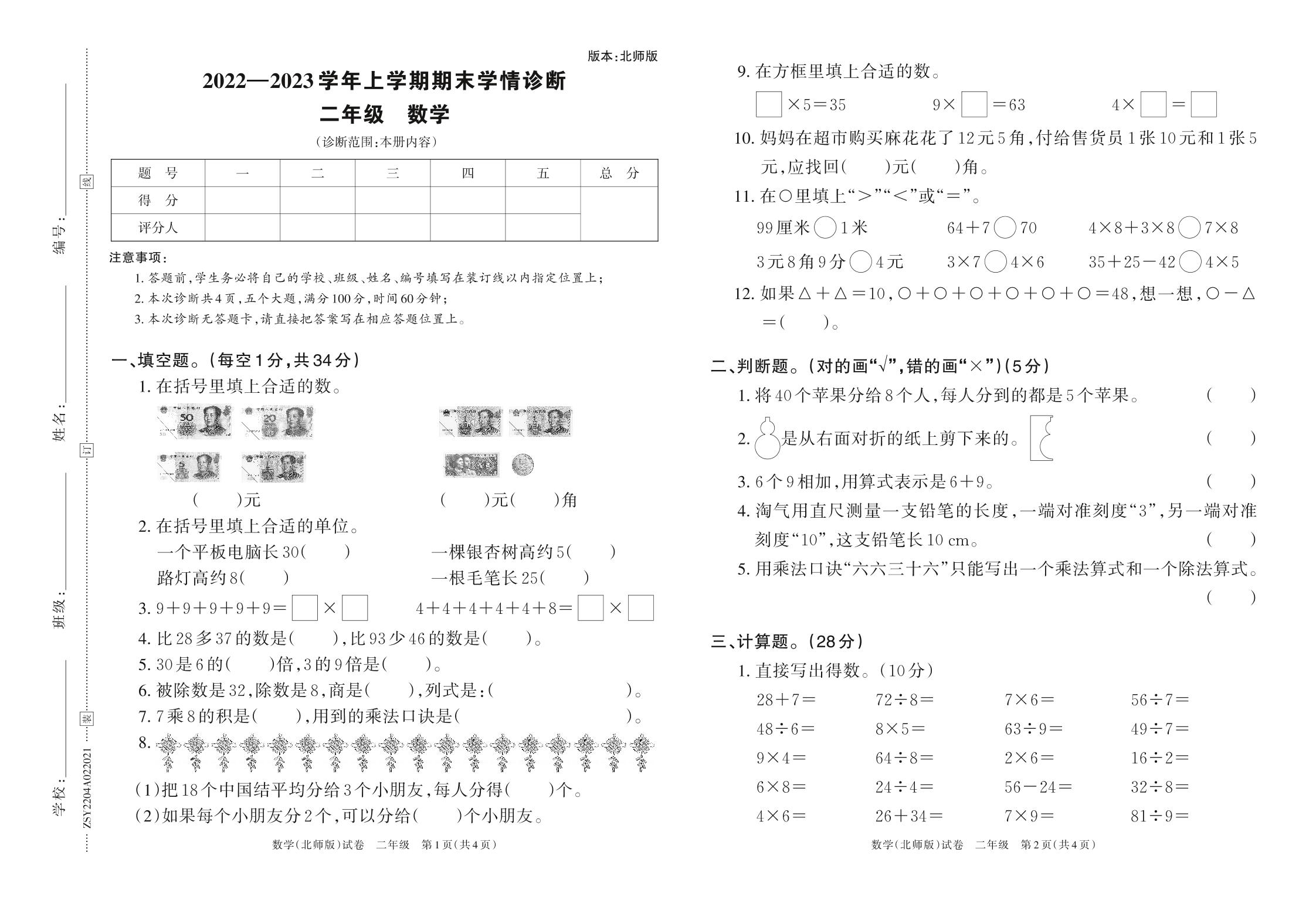 2022—2023学年上学期期末学情诊断A卷二年级数学(北师版)