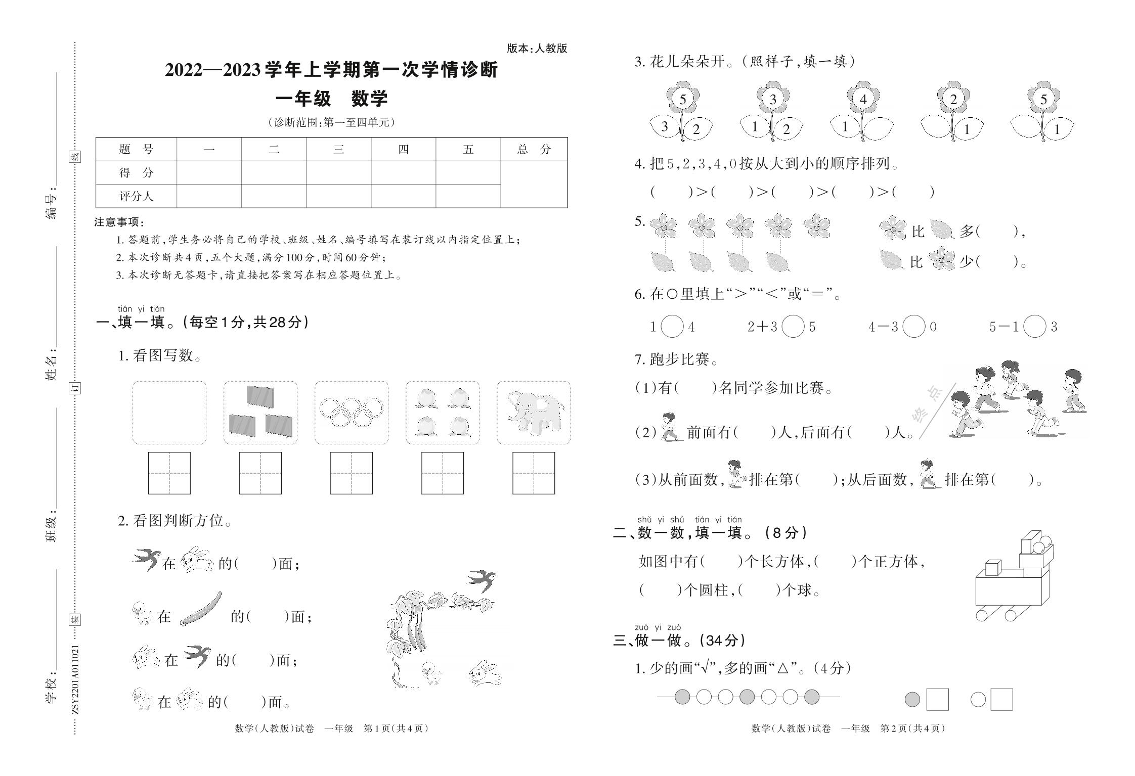 2022—2023学年上学期第一次学情诊断B卷一年级数学(人教版)
