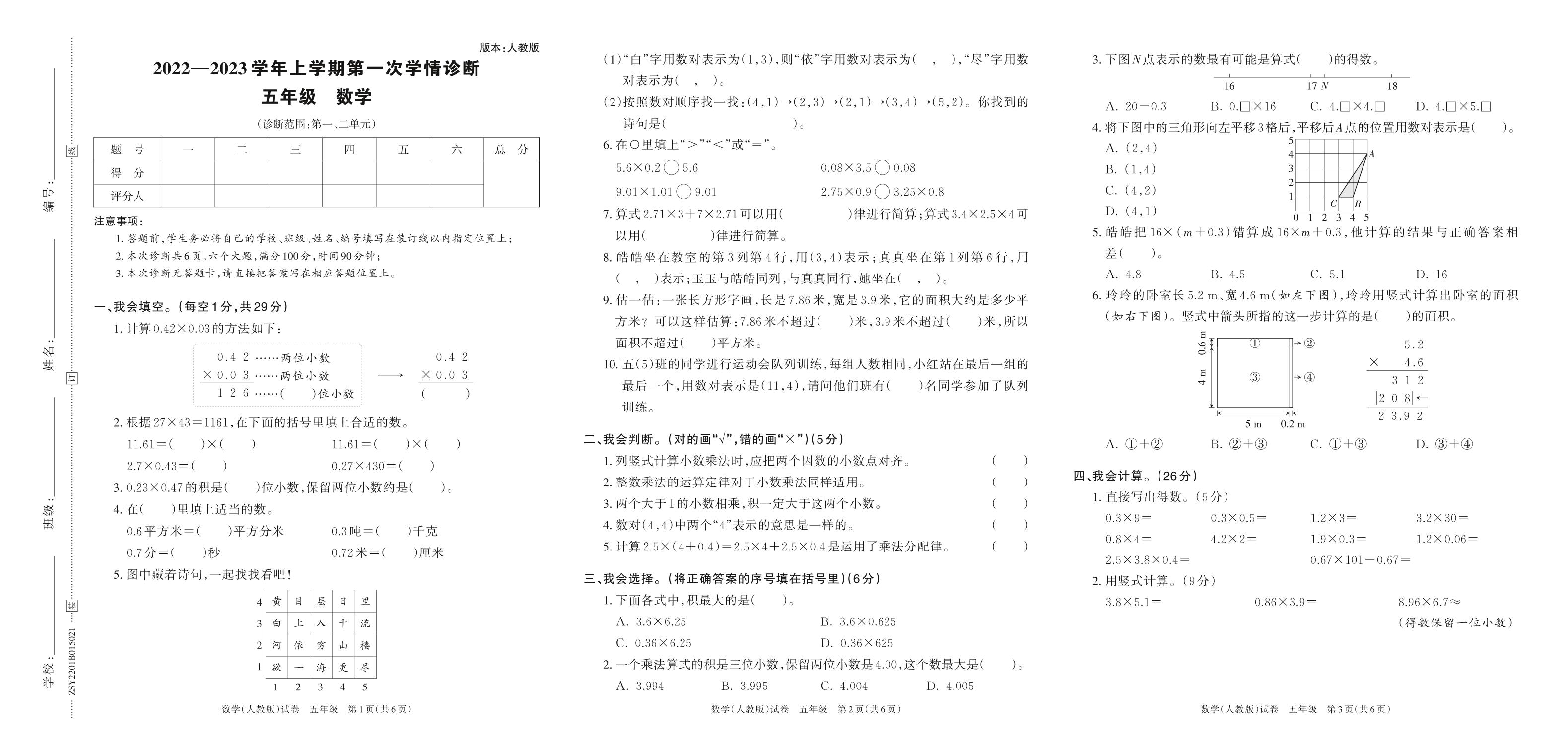 2022—2023学年上学期第一次学情诊断B卷五年级数学(人教版)