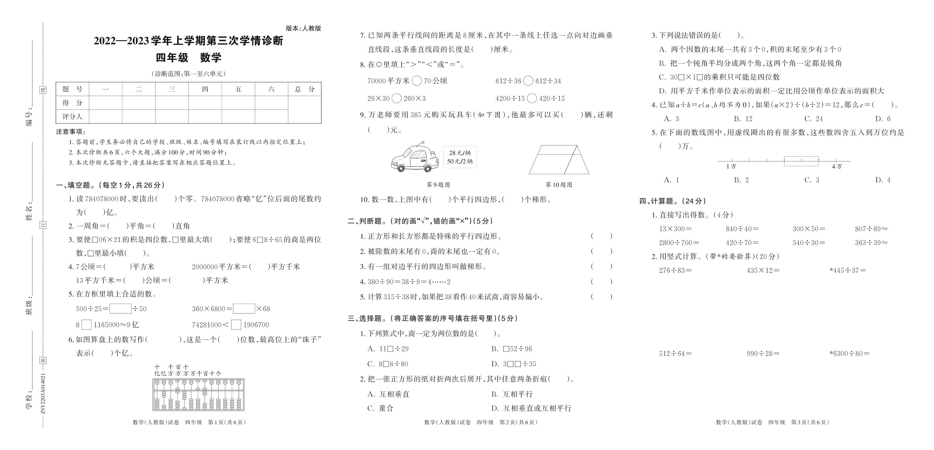 2022—2023学年上学期第三次学情诊断A卷四年级数学(人教版)