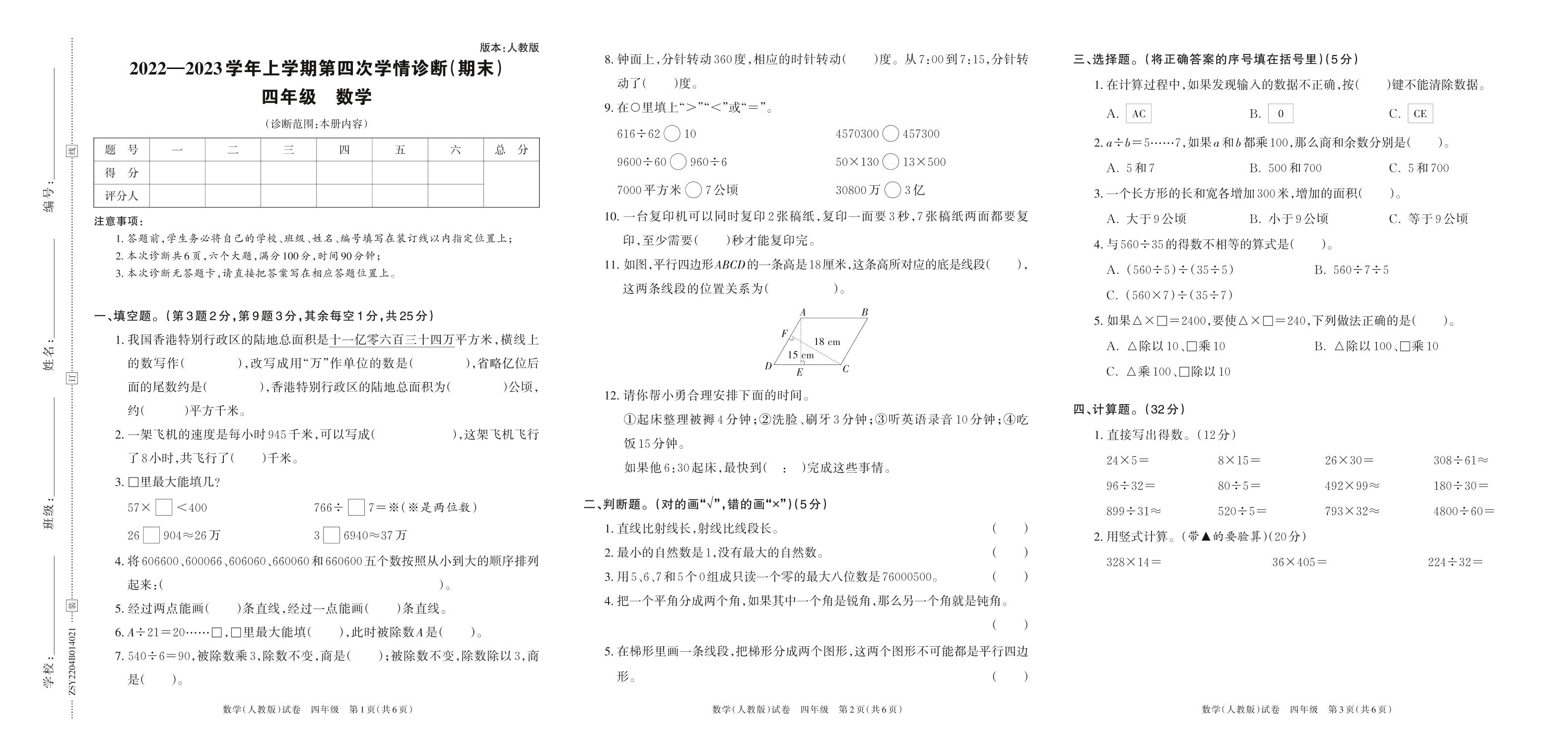 2022—2023学年上学期第四次学情诊断(期末)B卷四年级数学(人教版)