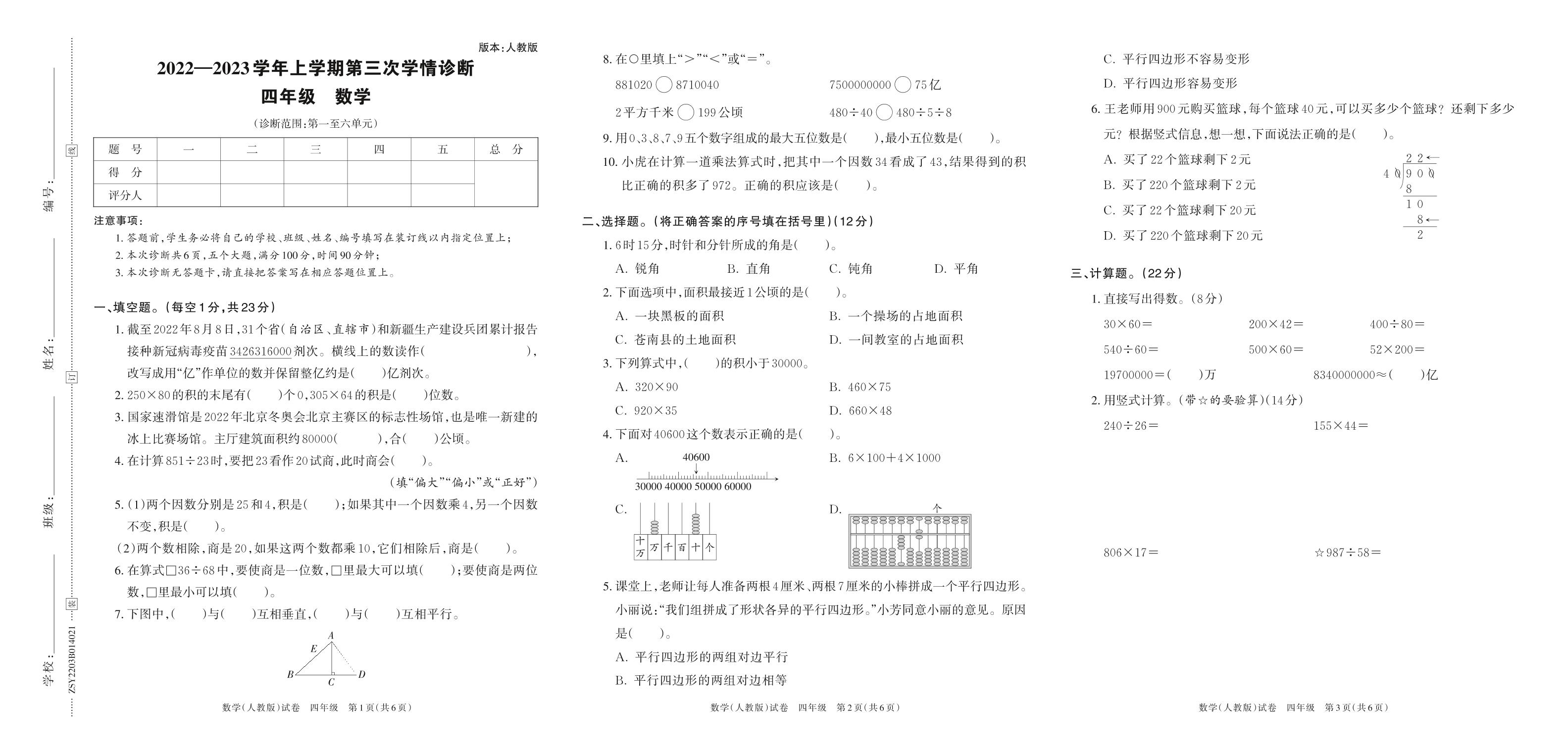 2022—2023学年上学期第三次学情诊断B卷四年级数学(人教版)
