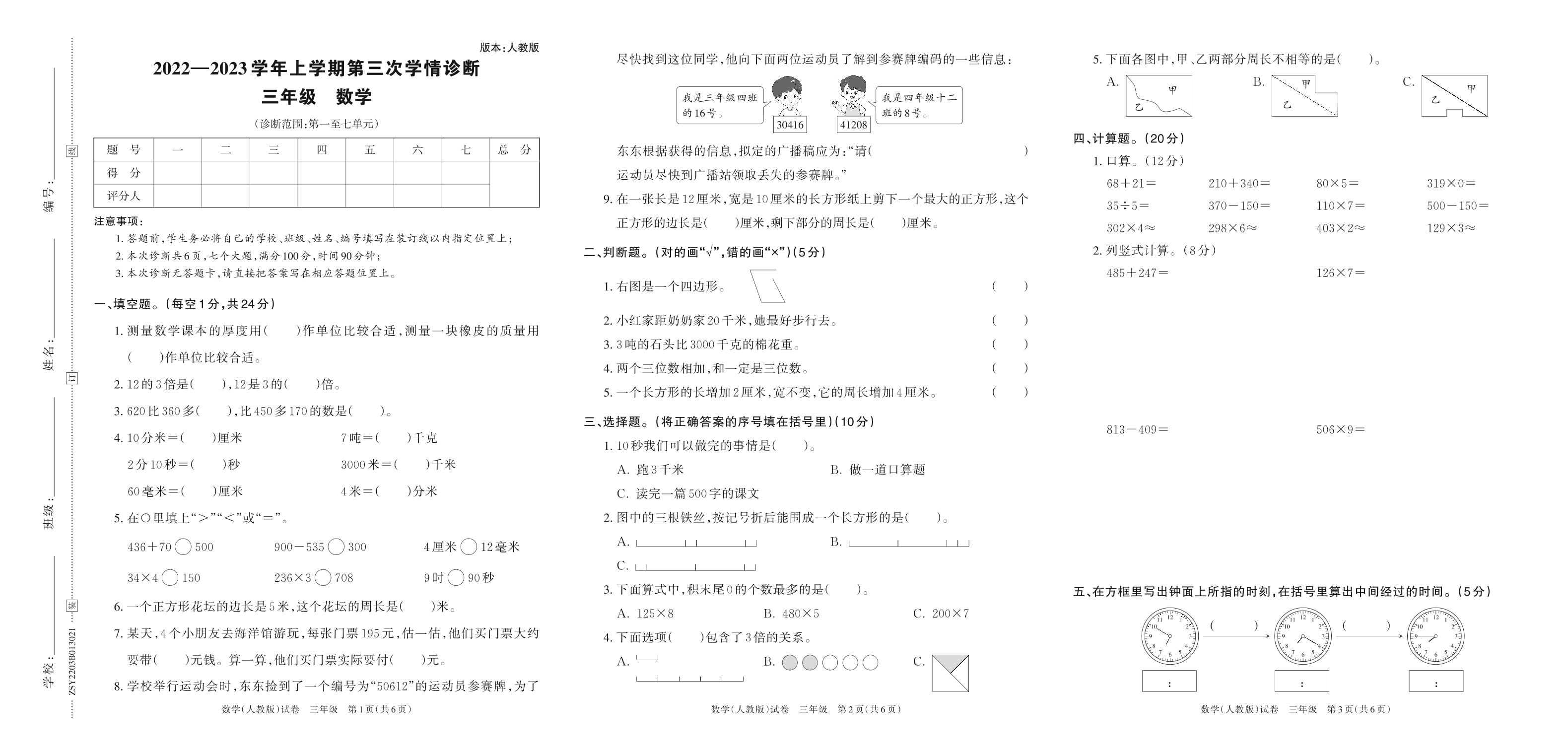 2022—2023学年上学期第三次学情诊断B卷三年级数学(人教版)