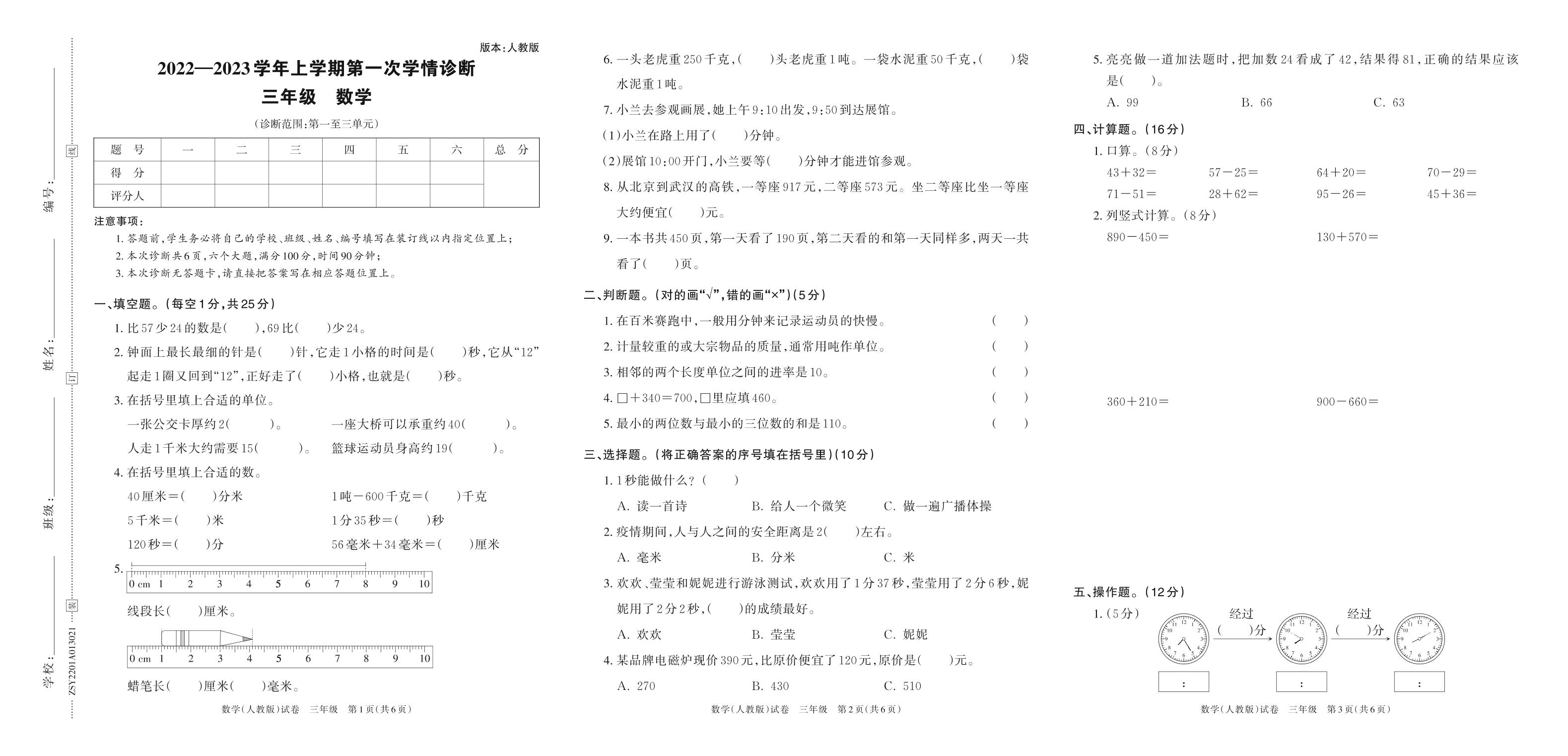 2022—2023学年上学期第一次学情诊断A卷三年级数学(人教版)