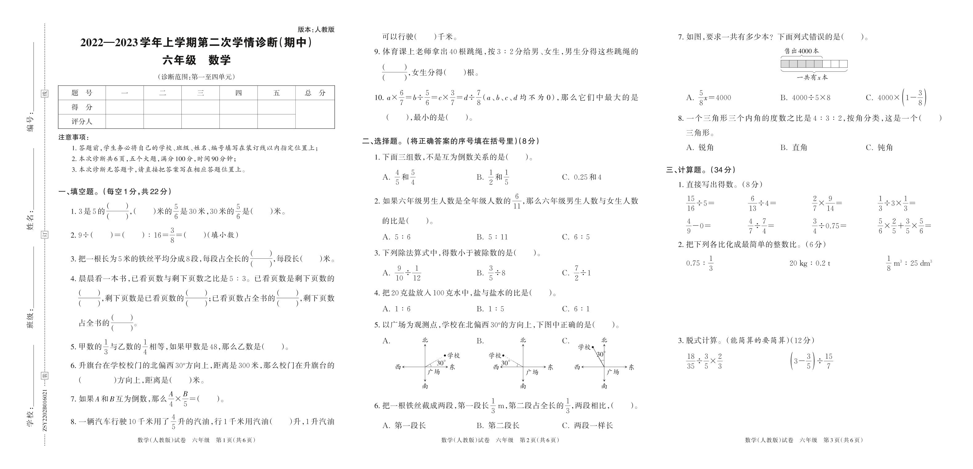 2022—2023学年上学期第二次学情诊断(期中)B卷六年级数学(人教版)