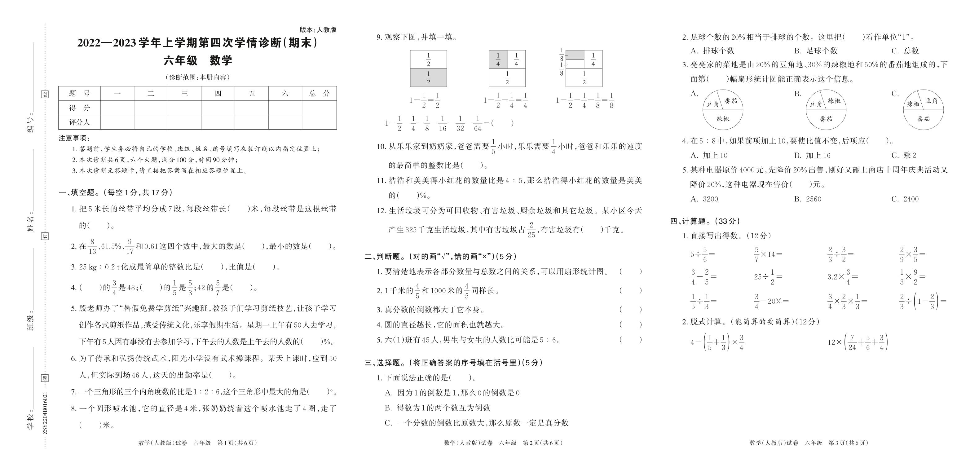 2022—2023学年上学期第四次学情诊断(期末)B卷六年级数学(人教版)