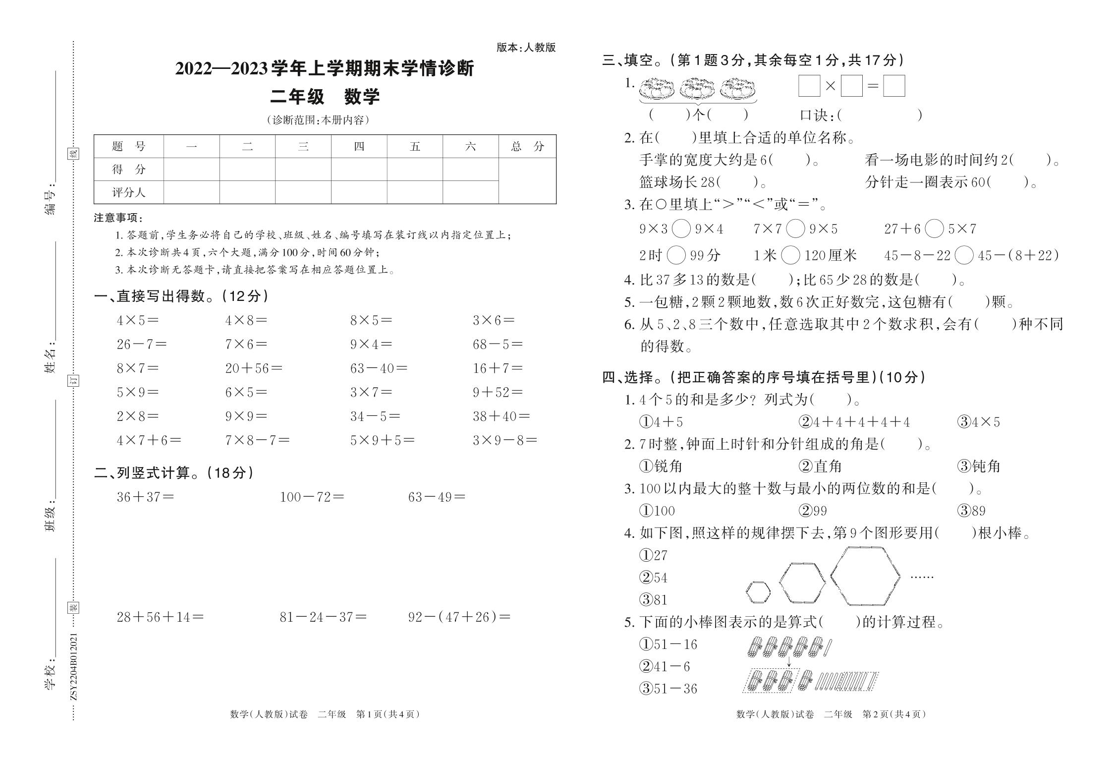 2022—2023学年上学期期末学情诊断B卷二年级数学(人教版)