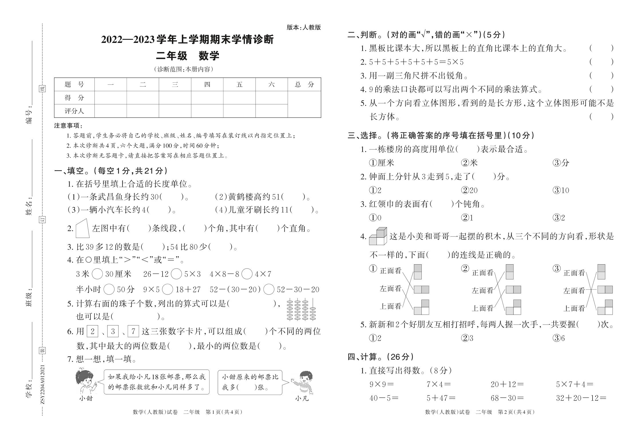 2022—2023学年上学期期末学情诊断A卷二年级数学(人教版)