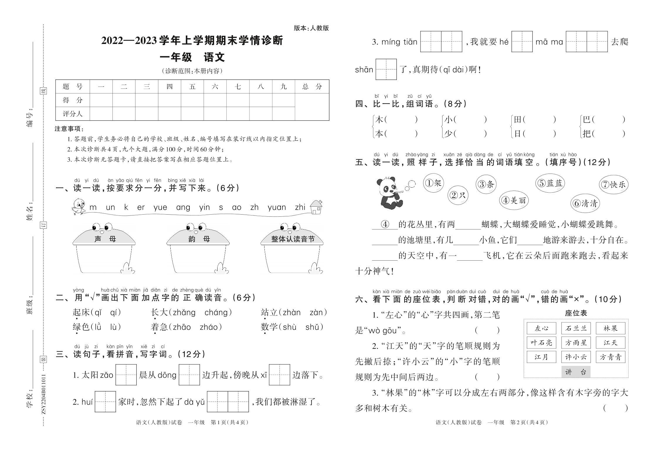 2022—2023学年上学期期末学情诊断B卷一年级语文(人教版)