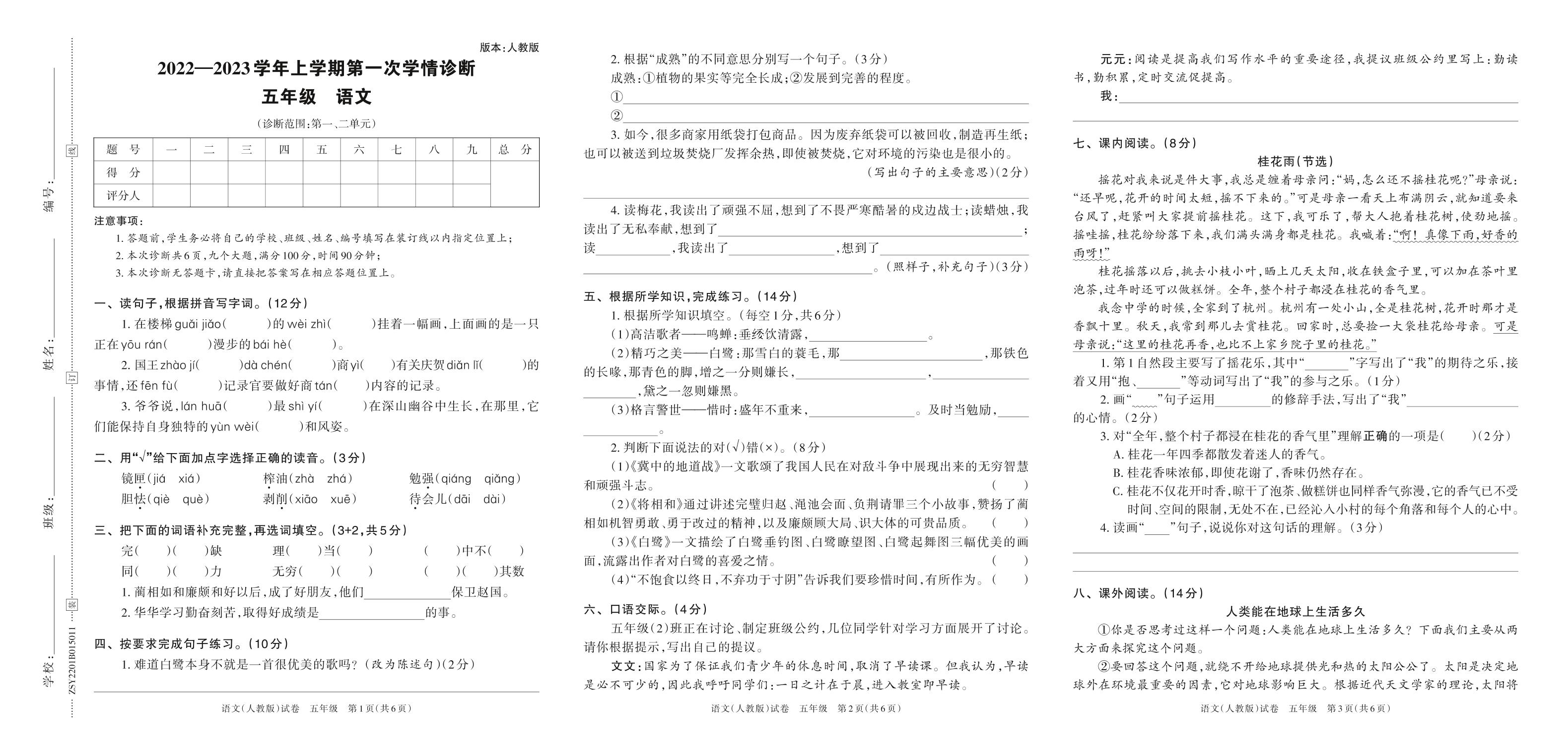 2022—2023学年上学期第一次学情诊断B卷五年级语文(人教版)