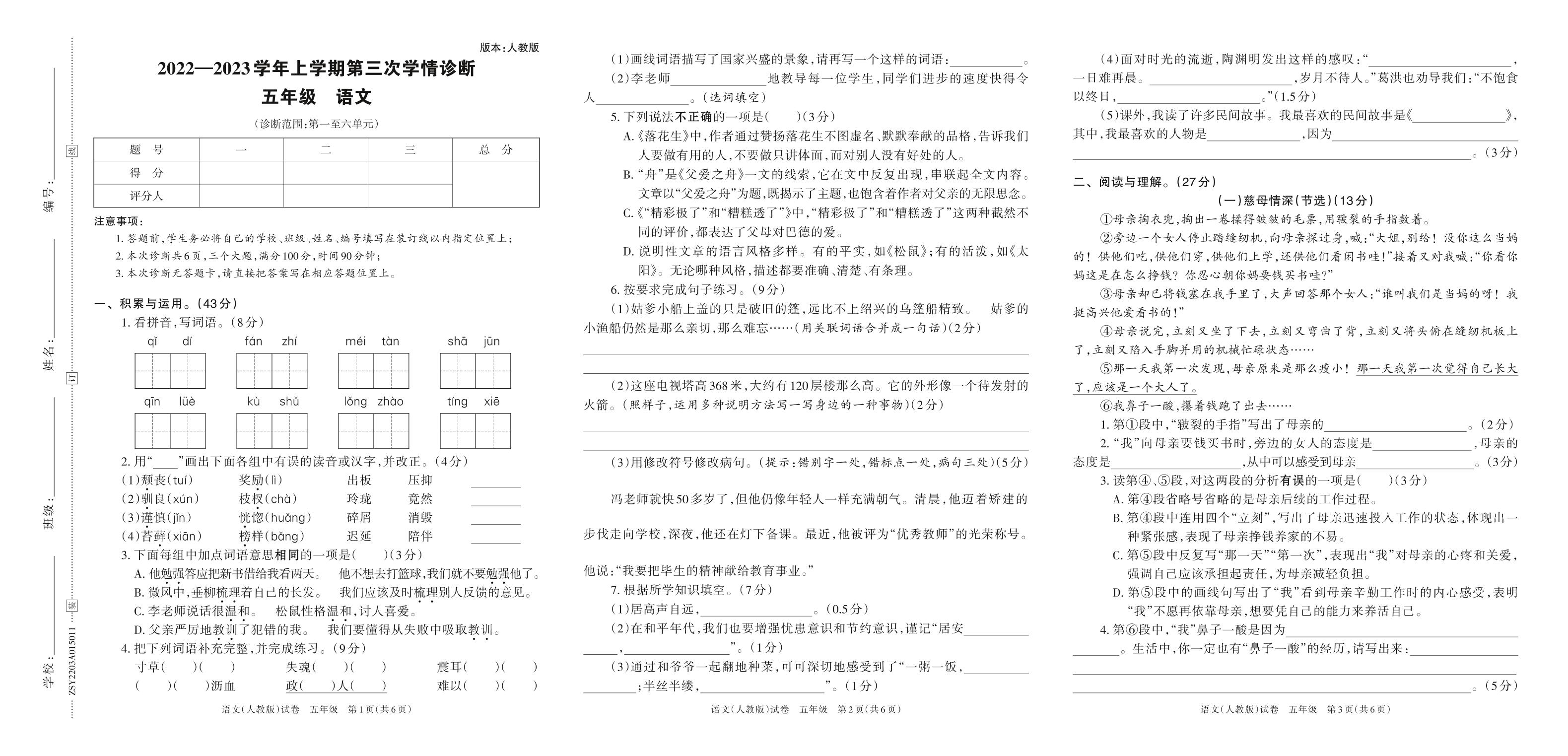 2022—2023学年上学期第三次学情诊断A卷五年级语文(人教版)