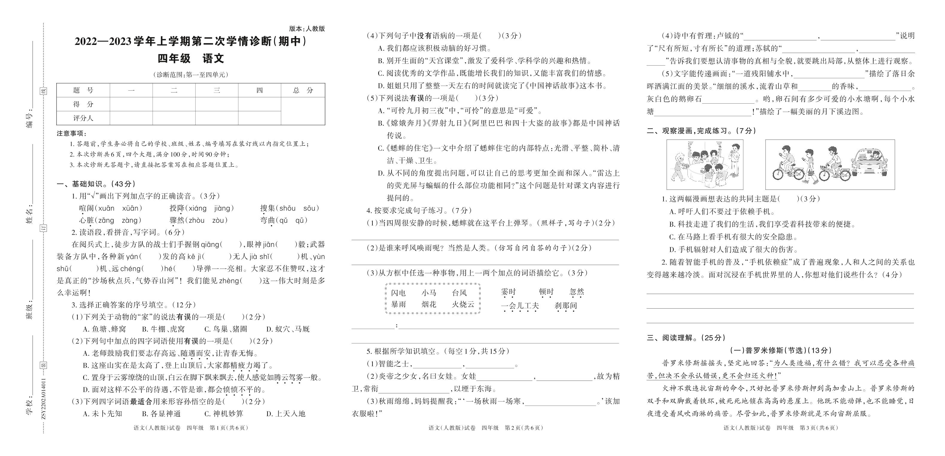 2022—2023学年上学期第二次学情诊断(期中)A卷四年级语文(人教版)