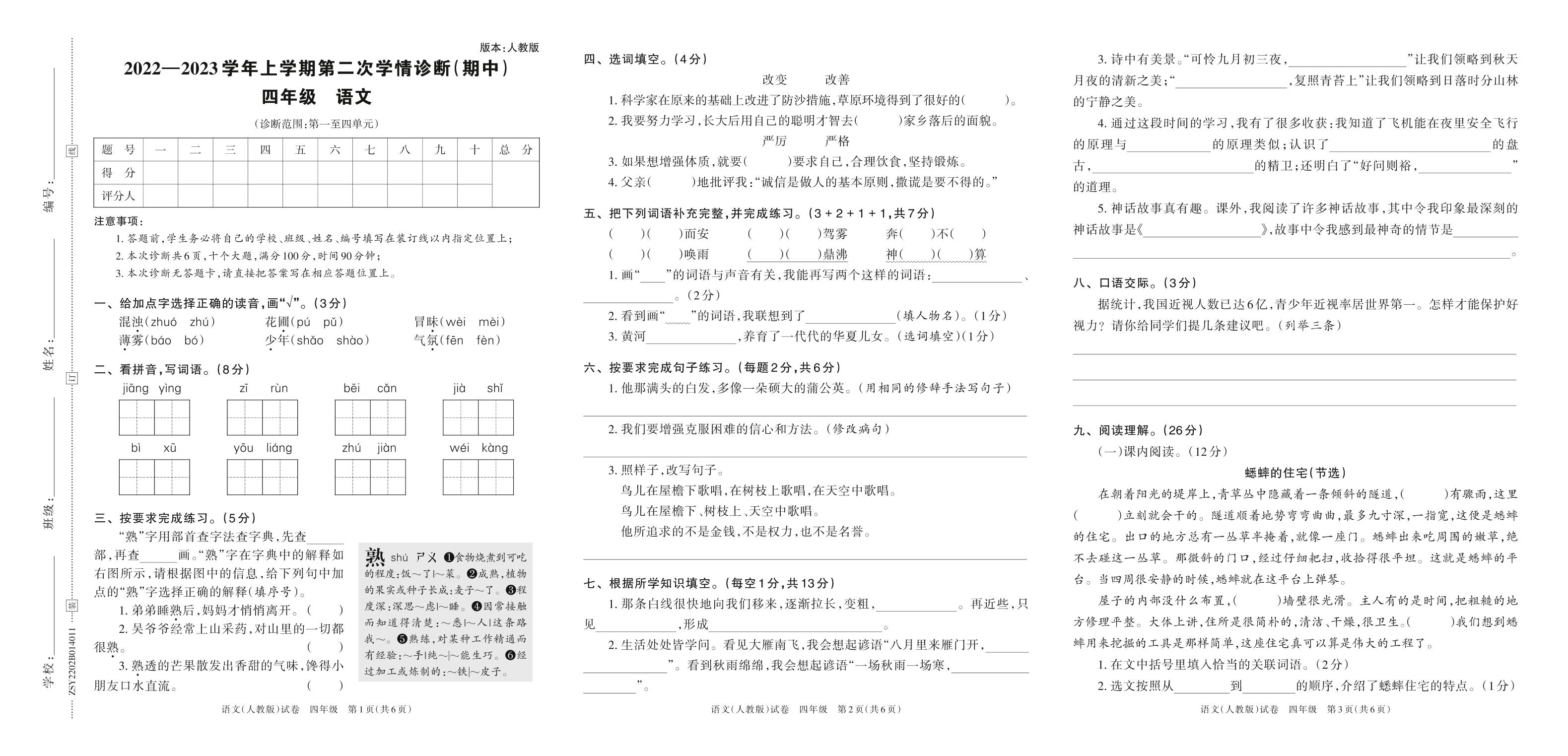 2022—2023学年上学期第二次学情诊断(期中)B卷四年级语文(人教版)