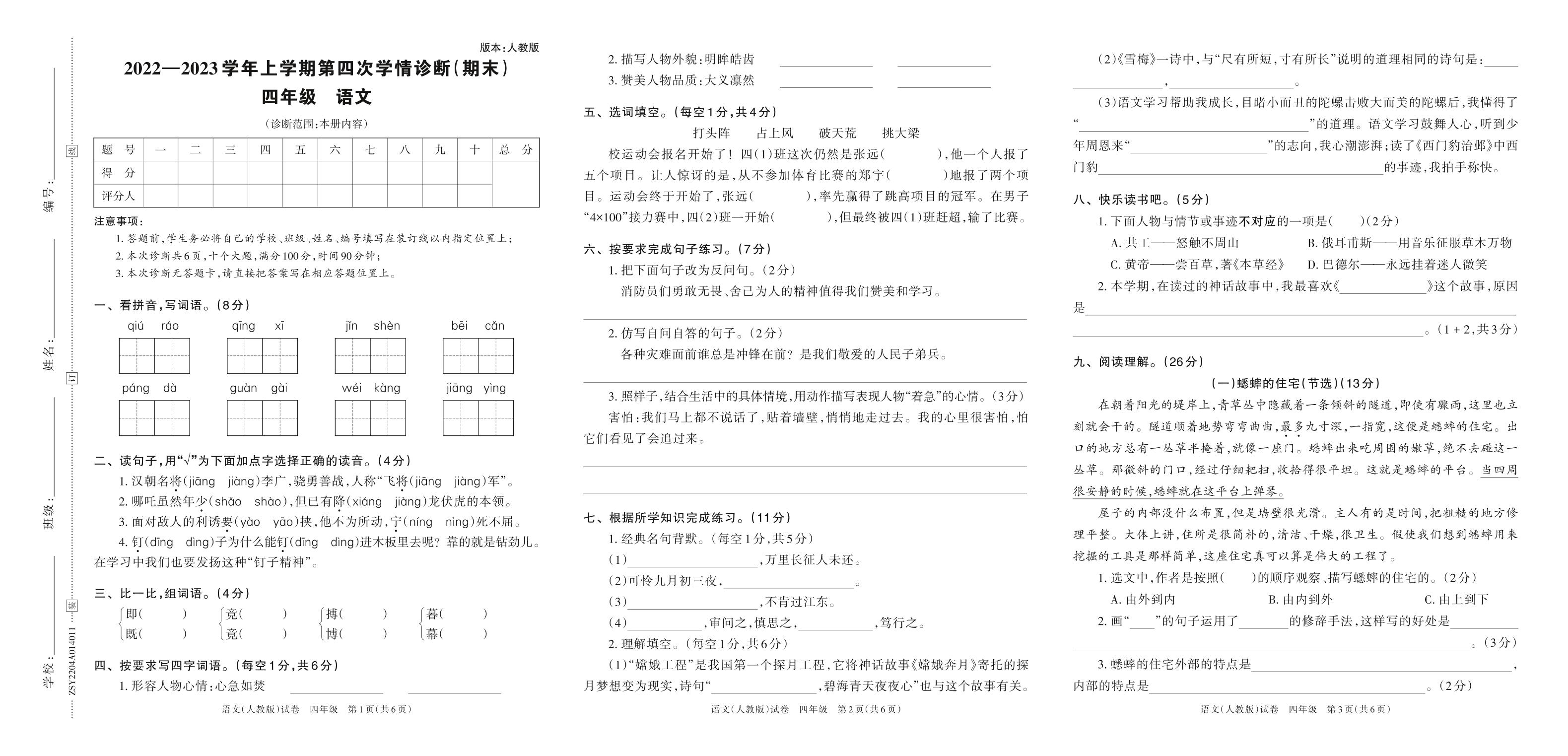 2022—2023学年上学期第四次学情诊断(期末)A卷四年级语文(人教版)