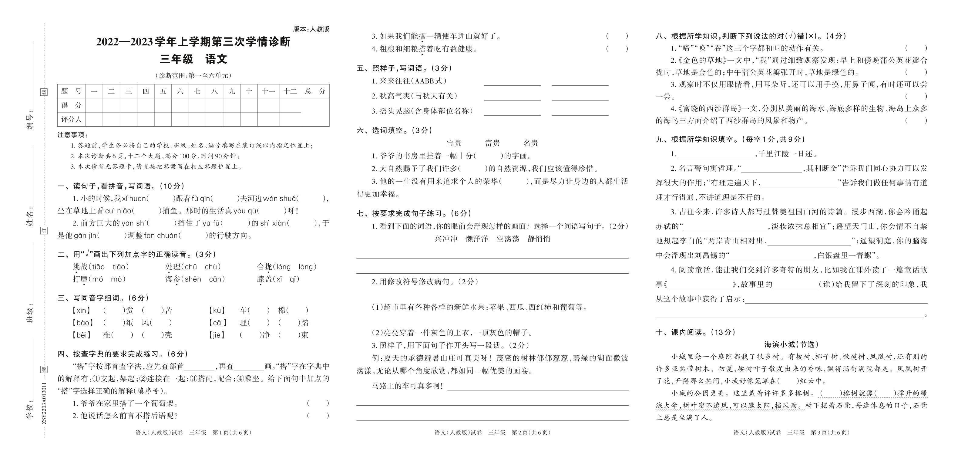 2022—2023学年上学期第三次学情诊断A卷三年级语文(人教版)