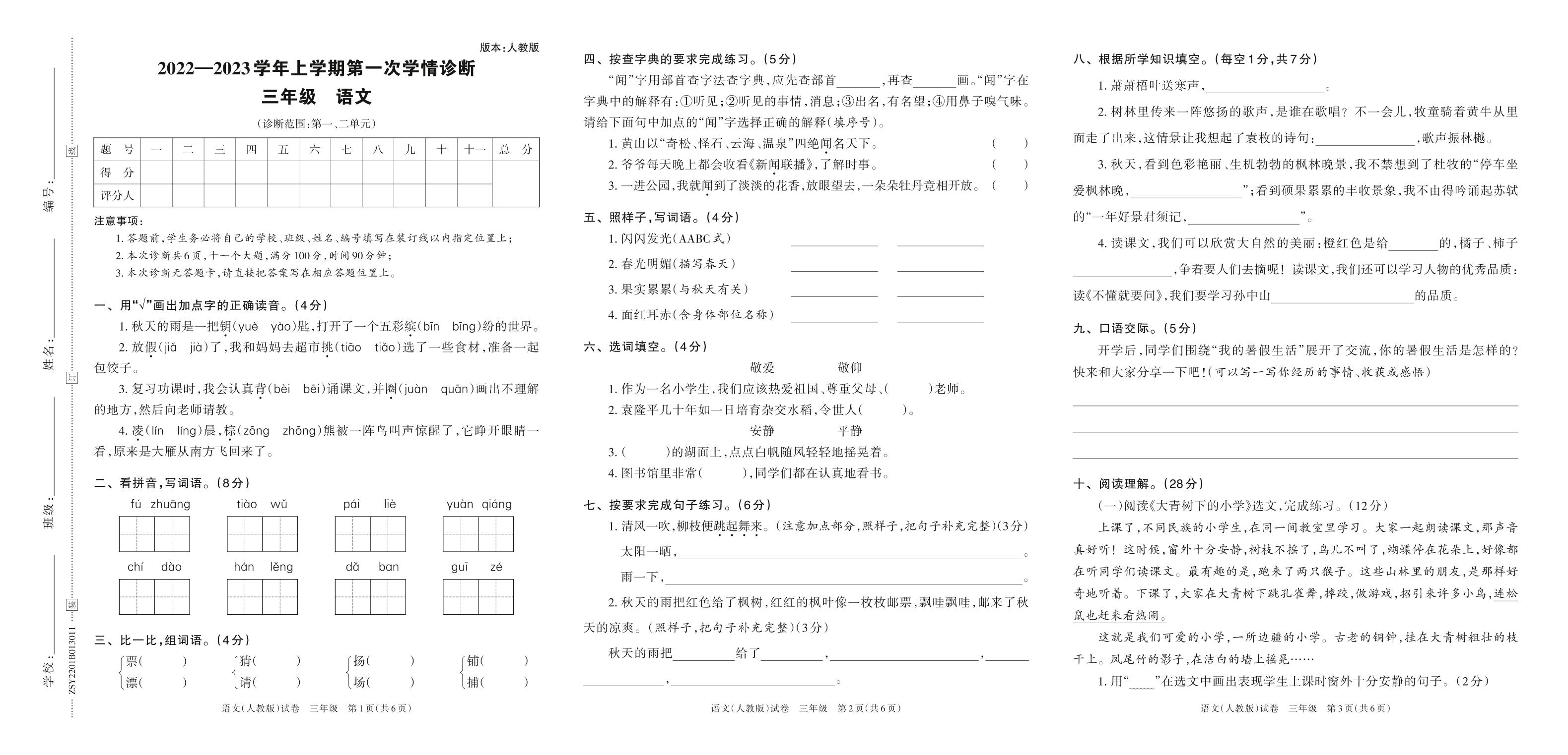 2022—2023学年上学期第一次学情诊断B卷三年级语文(人教版)