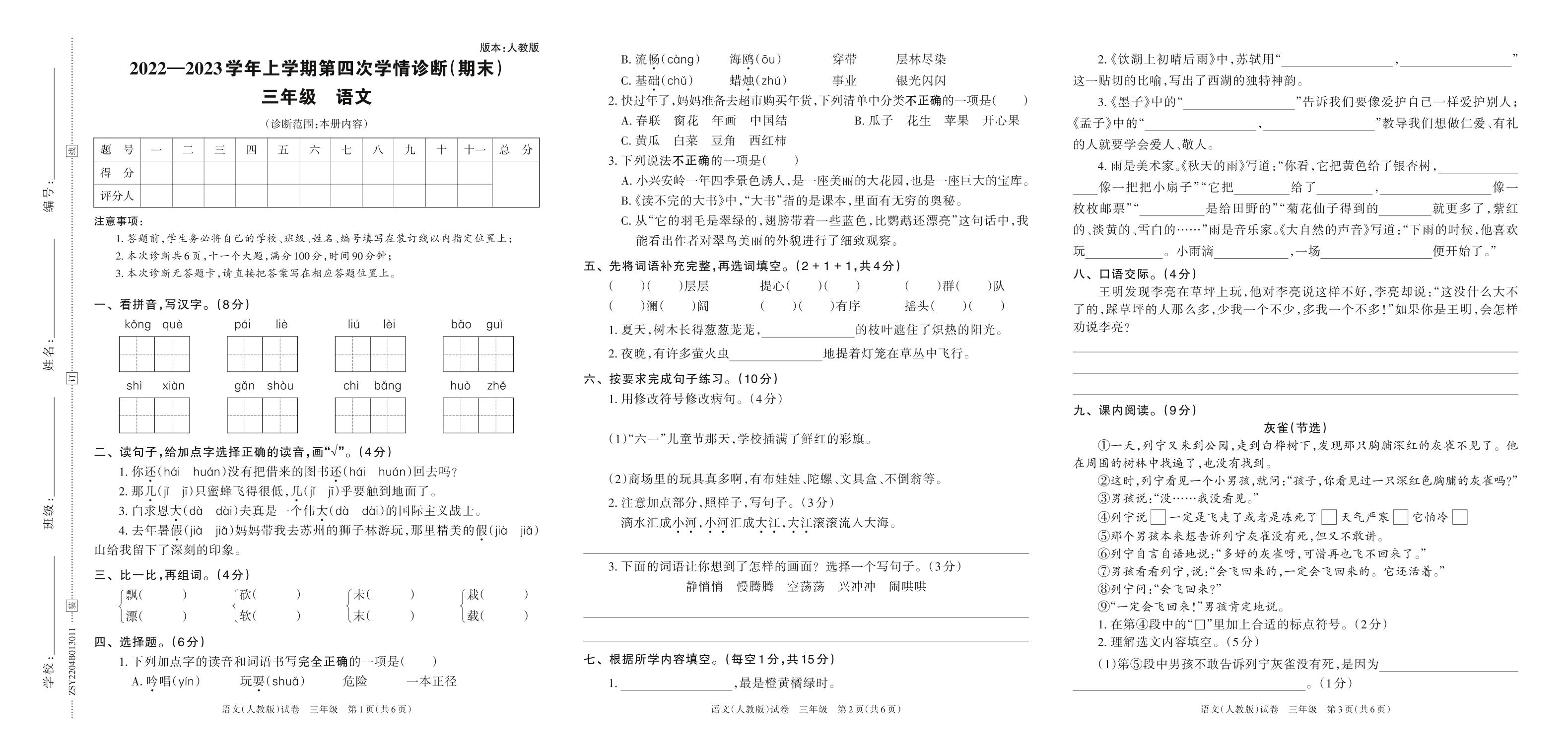 2022—2023学年上学期第四次学情诊断(期末)B卷三年级语文(人教版)