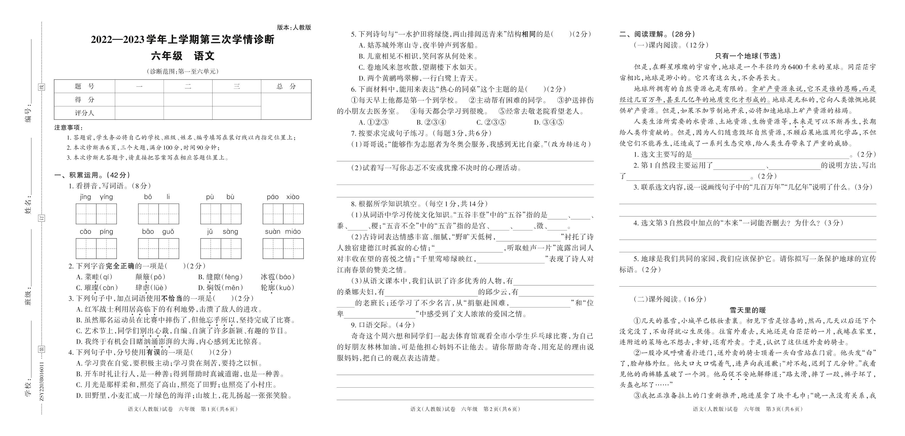 2022—2023学年上学期第三次学情诊断B卷六年级语文(人教版)