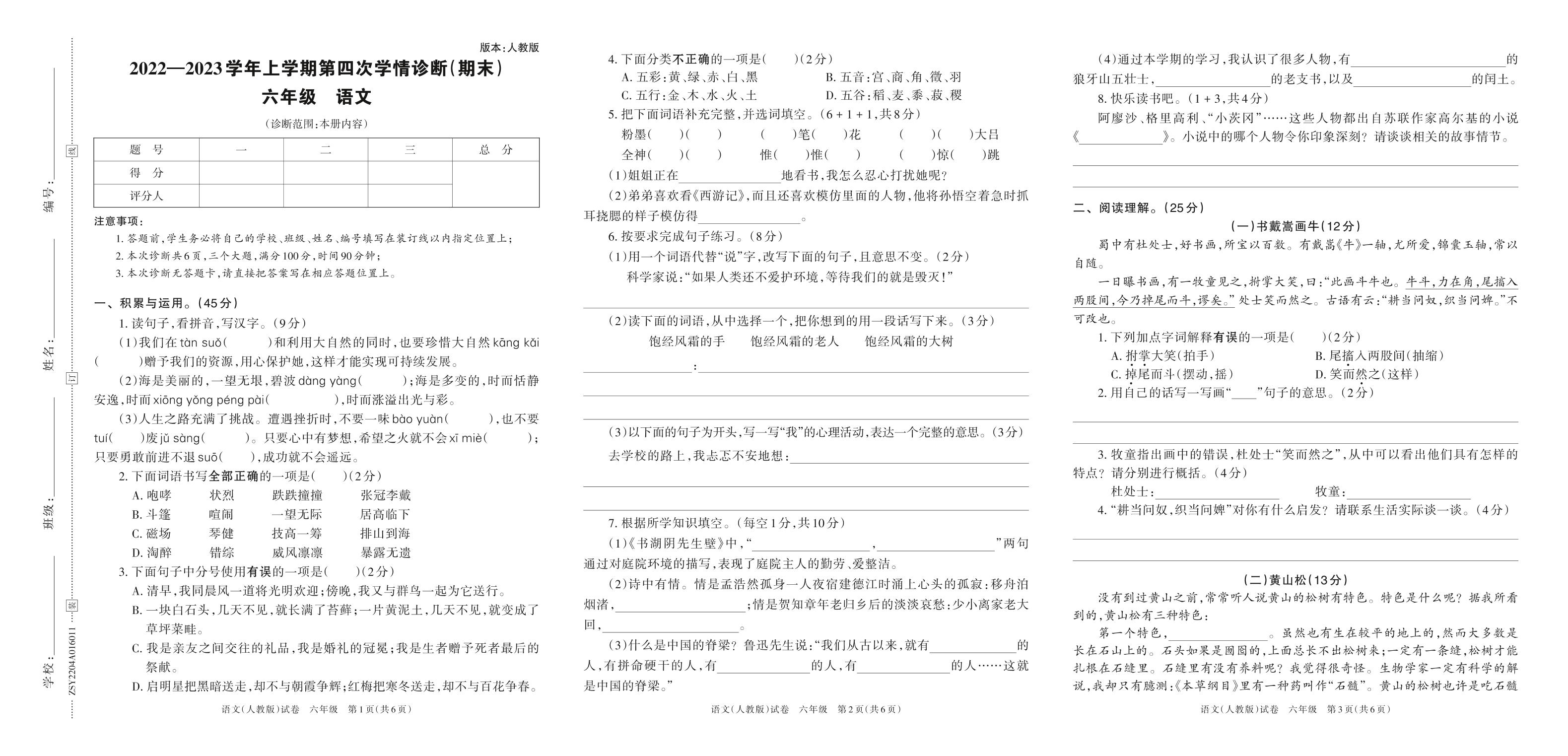 2022—2023学年上学期第四次学情诊断(期末)A卷六年级语文(人教版)