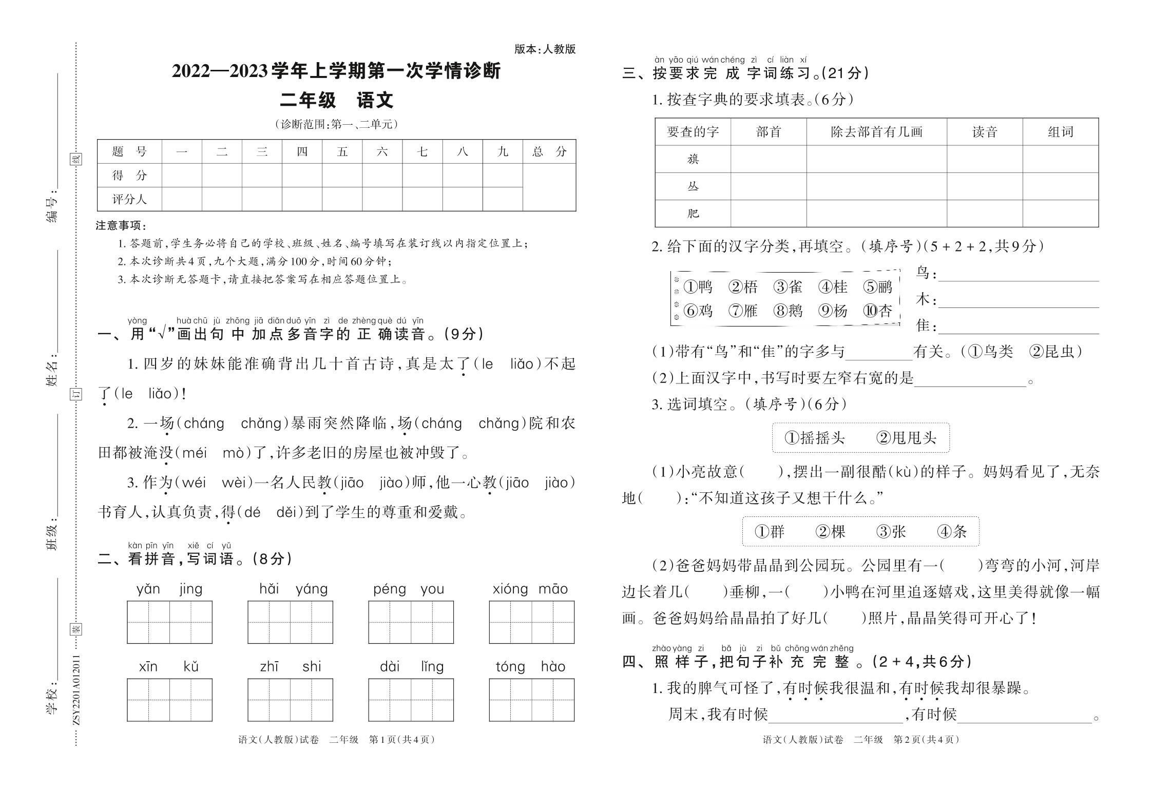 2022—2023学年上学期第一次学情诊断二年级语文(人教版)