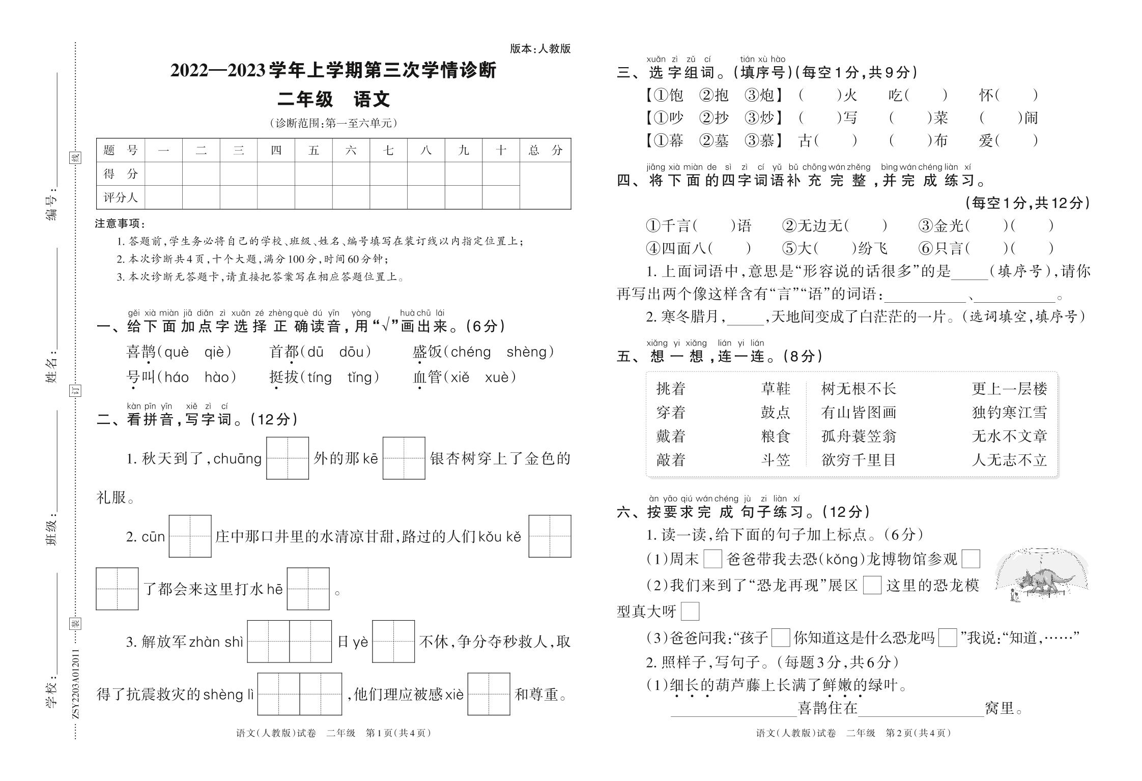 2022—2023学年上学期第三次学情诊断二年级语文(人教版)