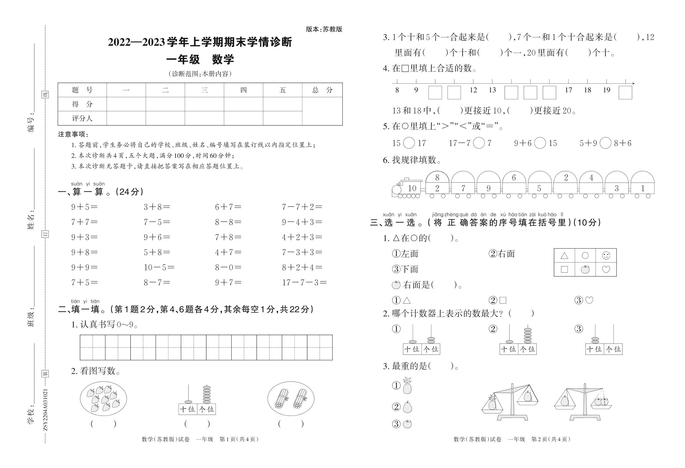 2022—2023学年上学期期末学情诊断A卷一年级数学(苏教版)