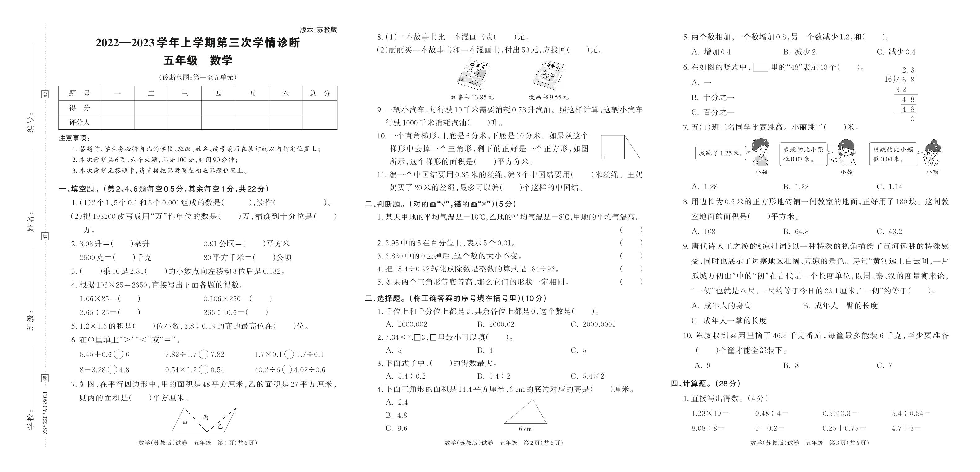 2022—2023学年上学期第三次学情诊断A卷五年级数学(苏教版)