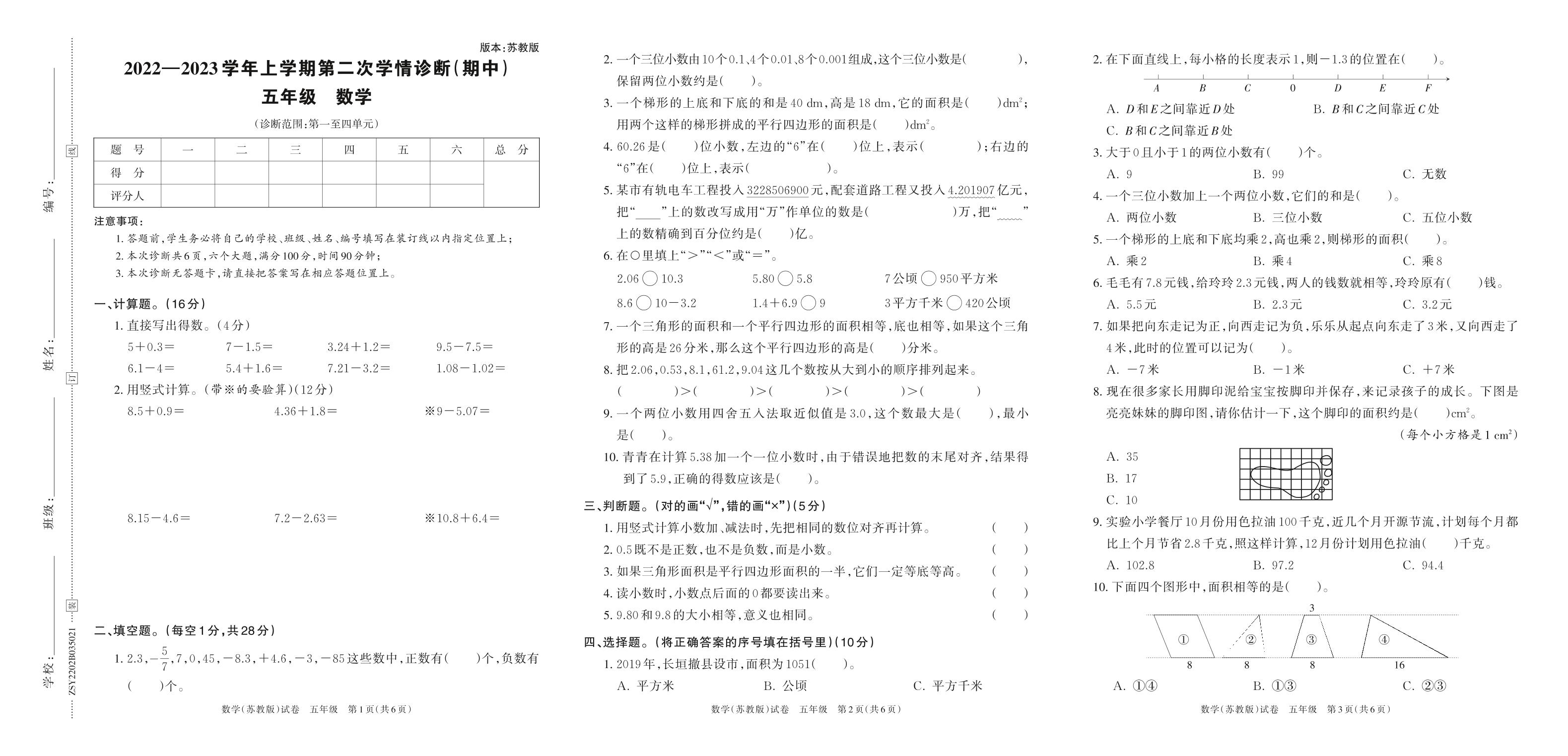 2022—2023学年上学期第二次学情诊断(期中)B卷五年级数学(苏教版)