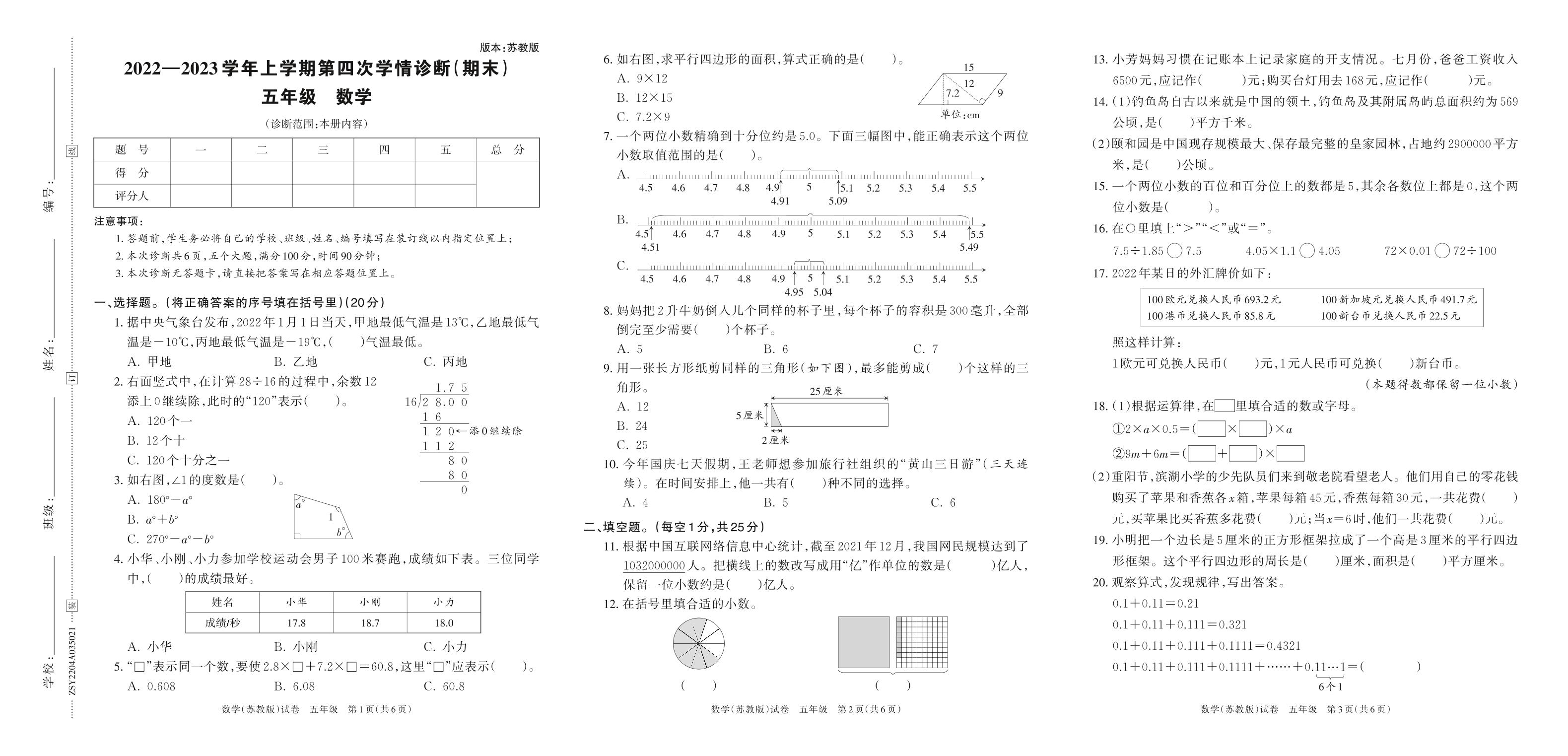2022—2023学年上学期第四次学情诊断(期末)A卷五年级数学(苏教版)