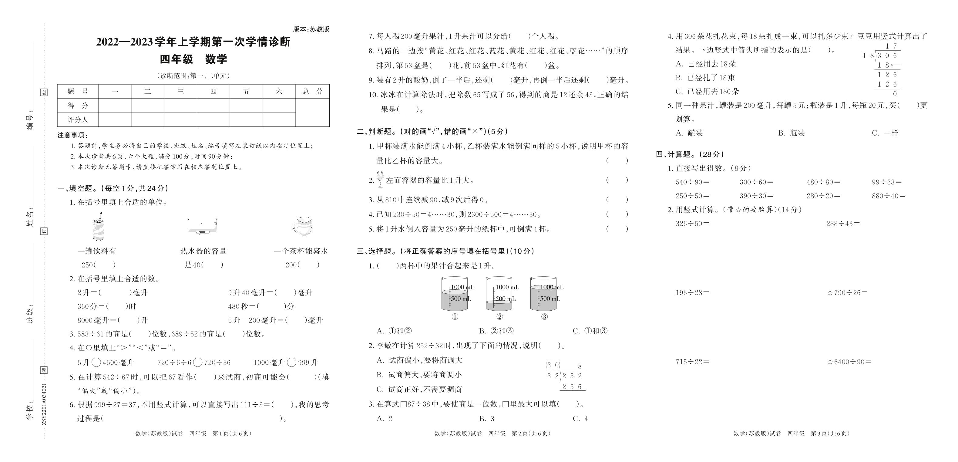 四年级数学苏教版上册月考卷