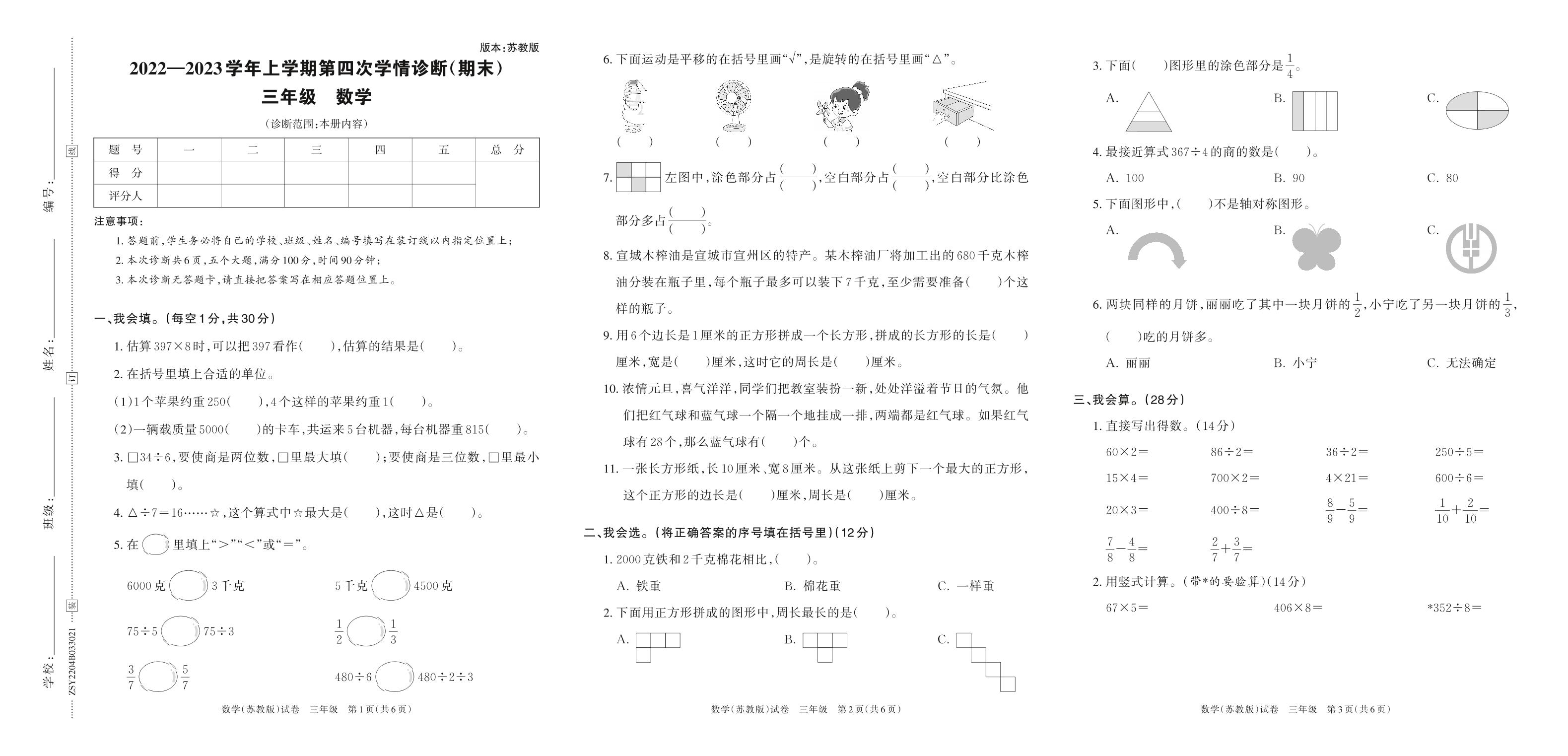 2022—2023学年上学期第四次学情诊断(期末)B卷三年级数学(苏教版)