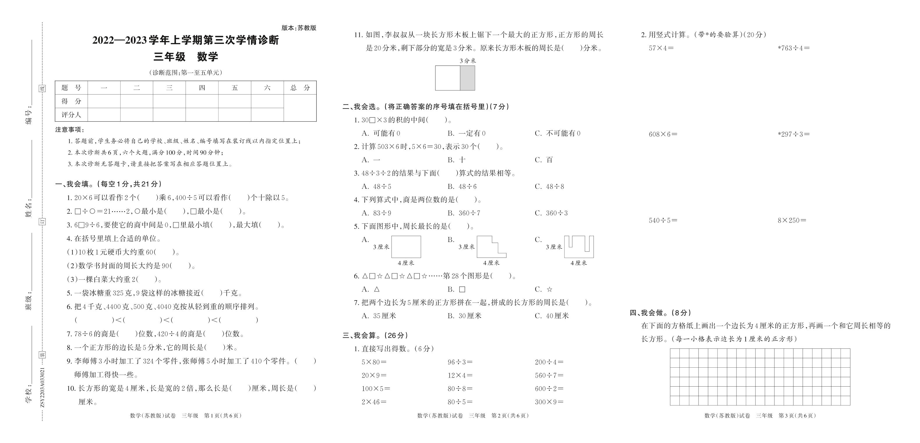 2022—2023学年上学期第三次学情诊断A卷三年级数学(苏教版)