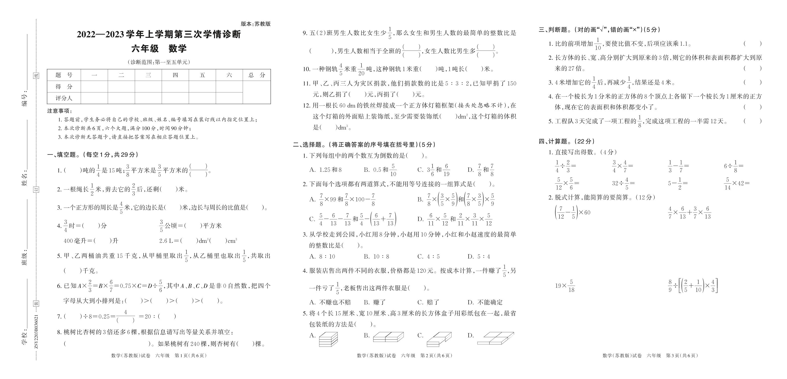 2022—2023学年上学期第三次学情诊断B卷六年级数学(苏教版)