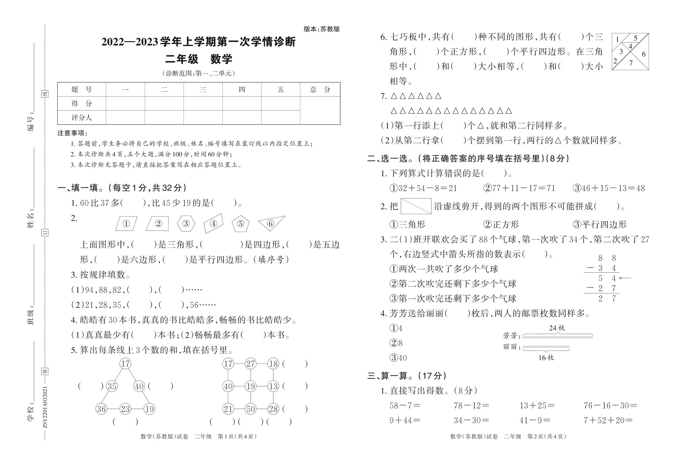2022—2023学年上学期第一次学情诊断二年级数学(苏教版)