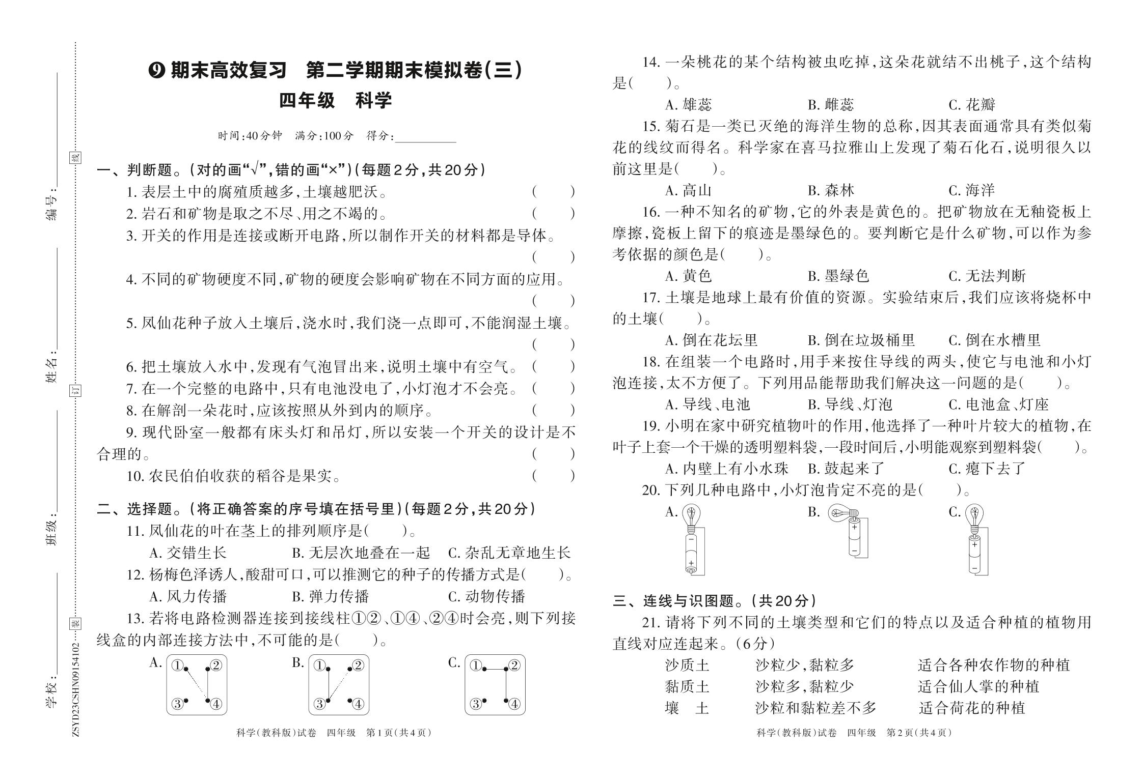2023年春下册四年级科学教科版 期末高效复习 第二学期期末模拟卷(三)