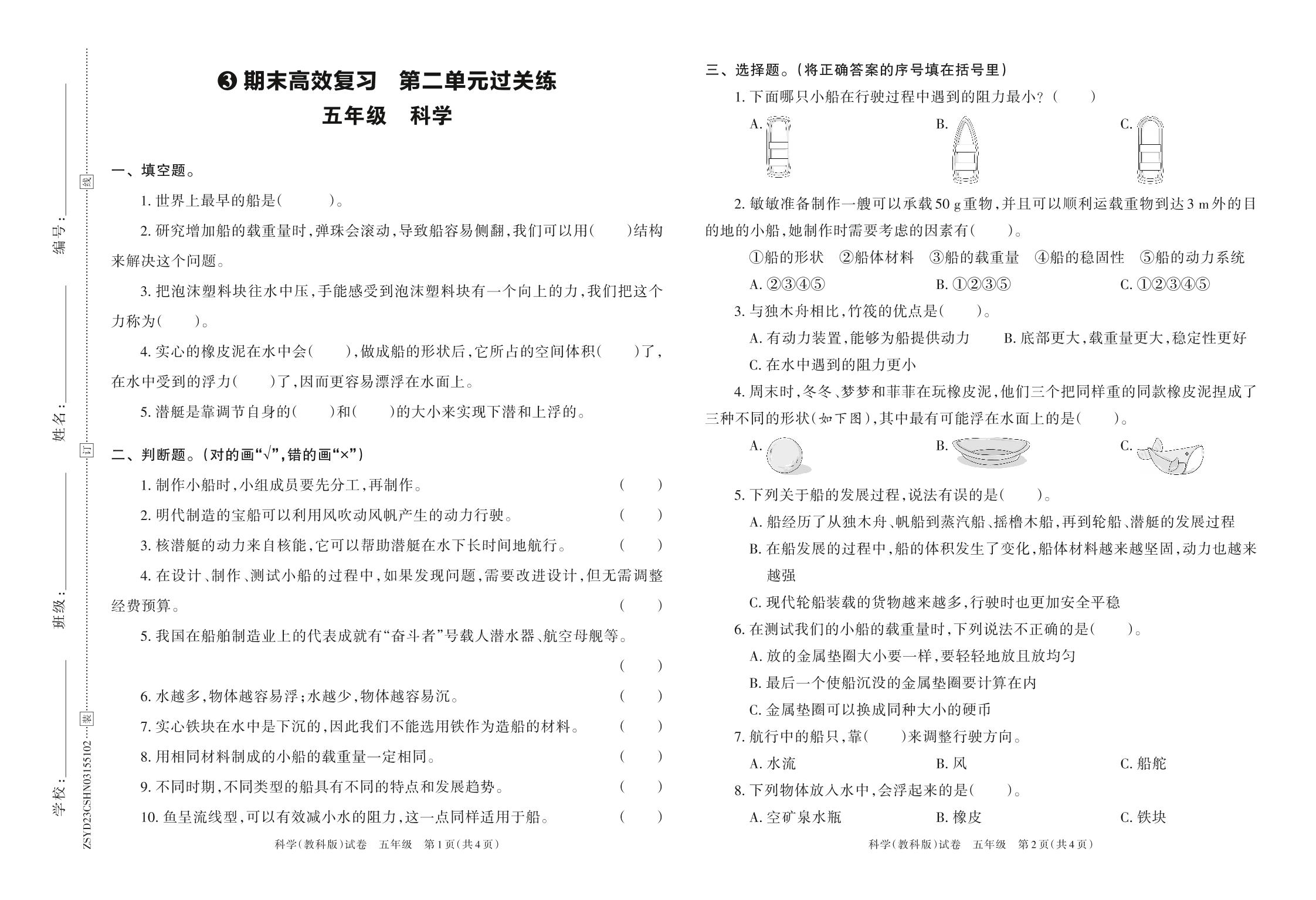 2023年春下册五年级科学教科版 期末高效复习 第二单元过关练