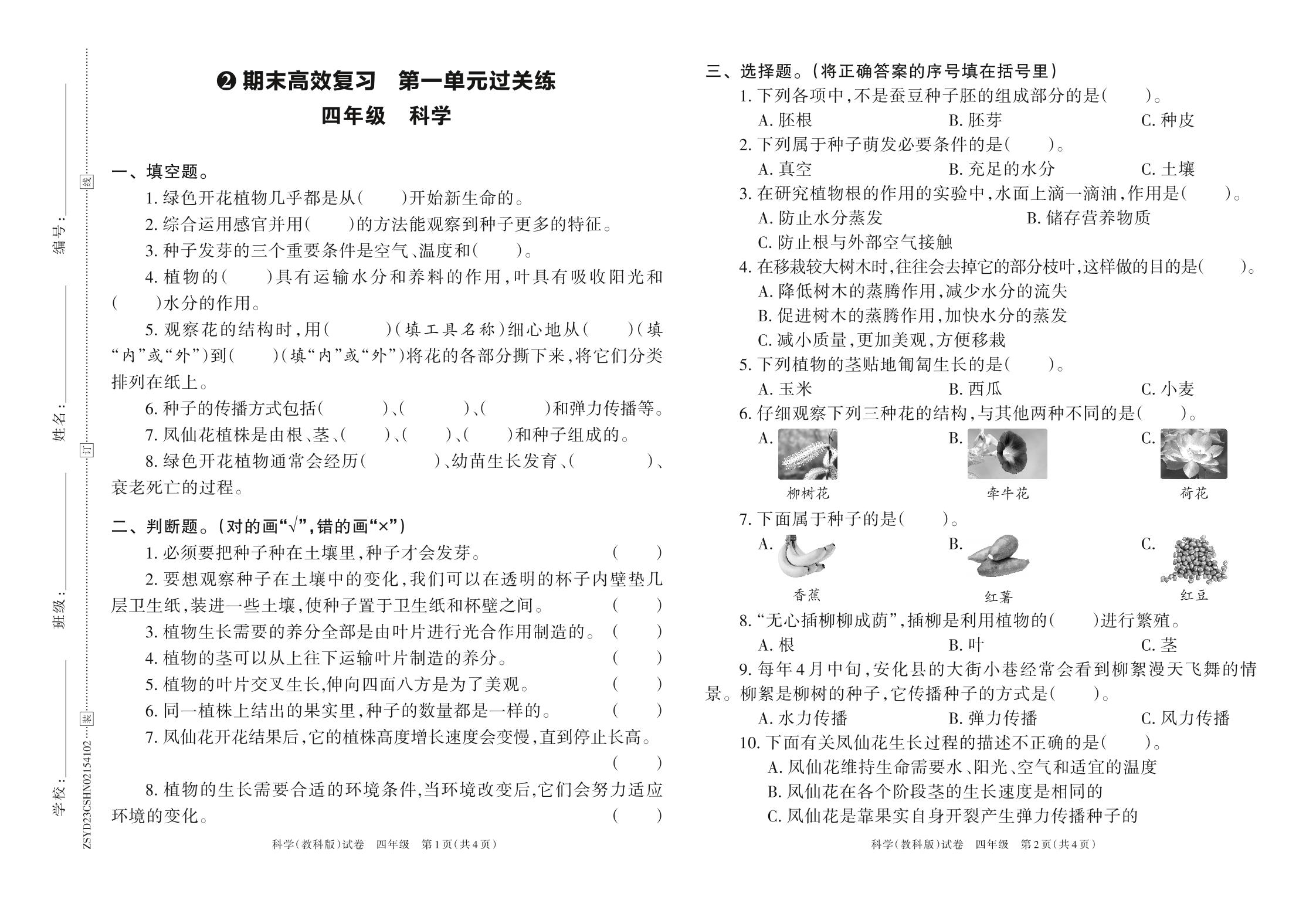 2023年春下册四年级科学教科版 期末高效复习 第一单元过关练