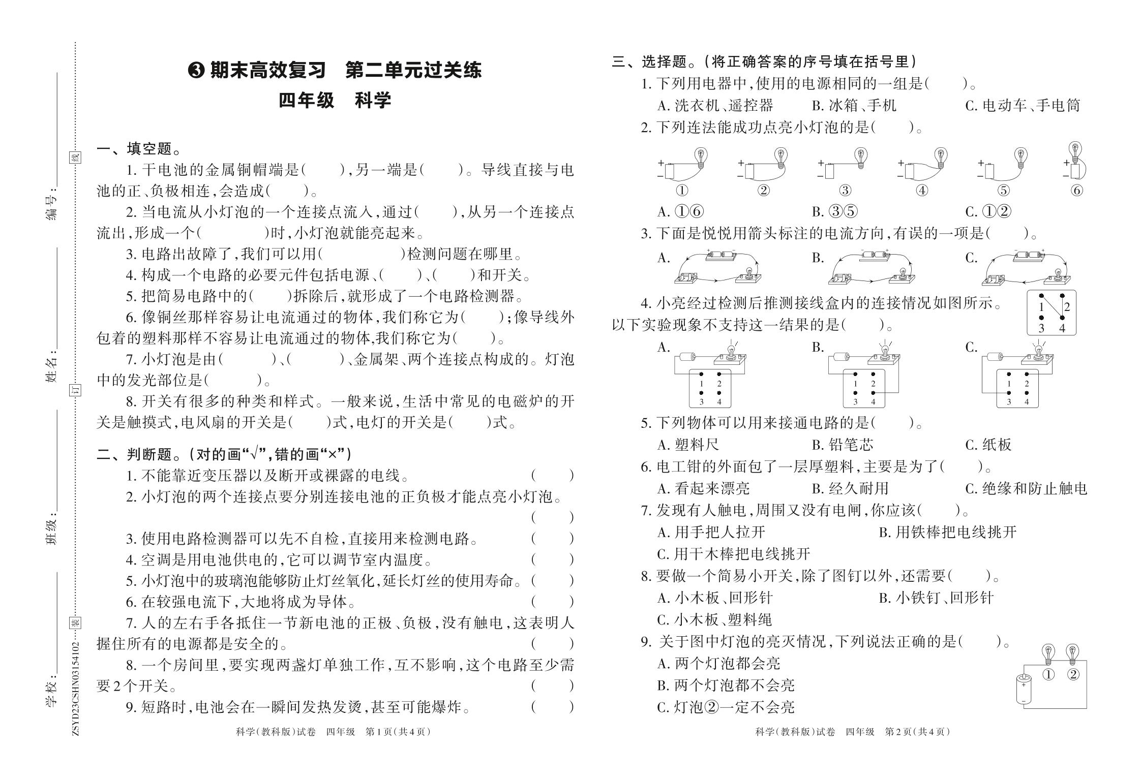2023年春下册四年级科学教科版 期末高效复习 第二单元过关练