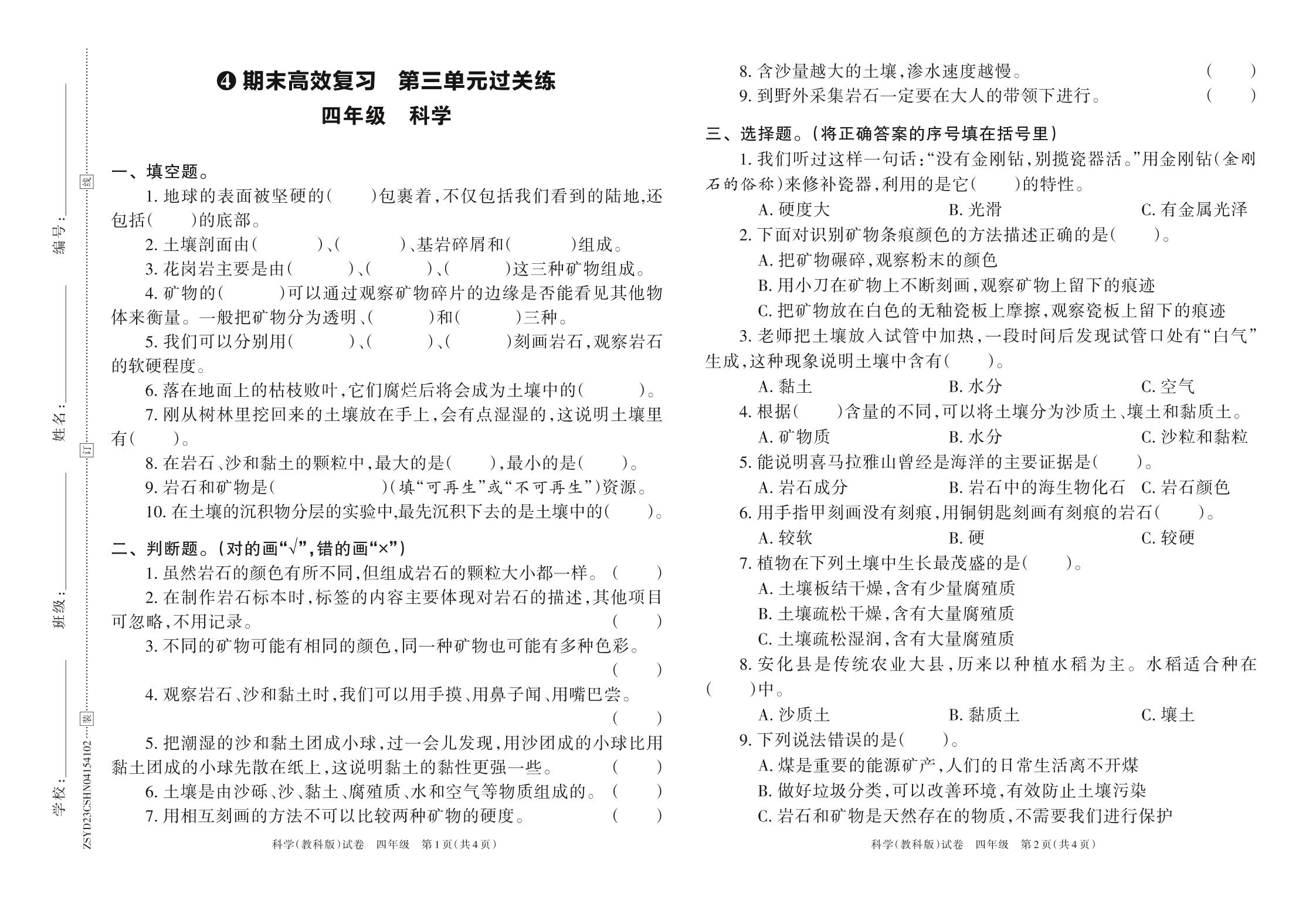 2023年春下册四年级科学教科版 期末高效复习 第三单元过关练