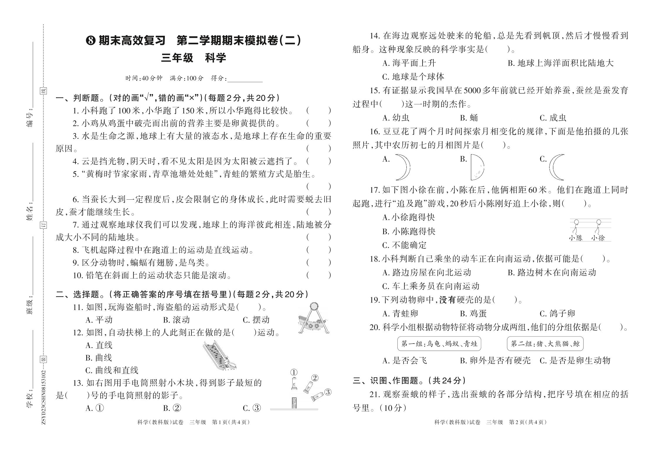 2023年春下册三年级科学教科版 期末高效复习 第二学期期末模拟卷(二)