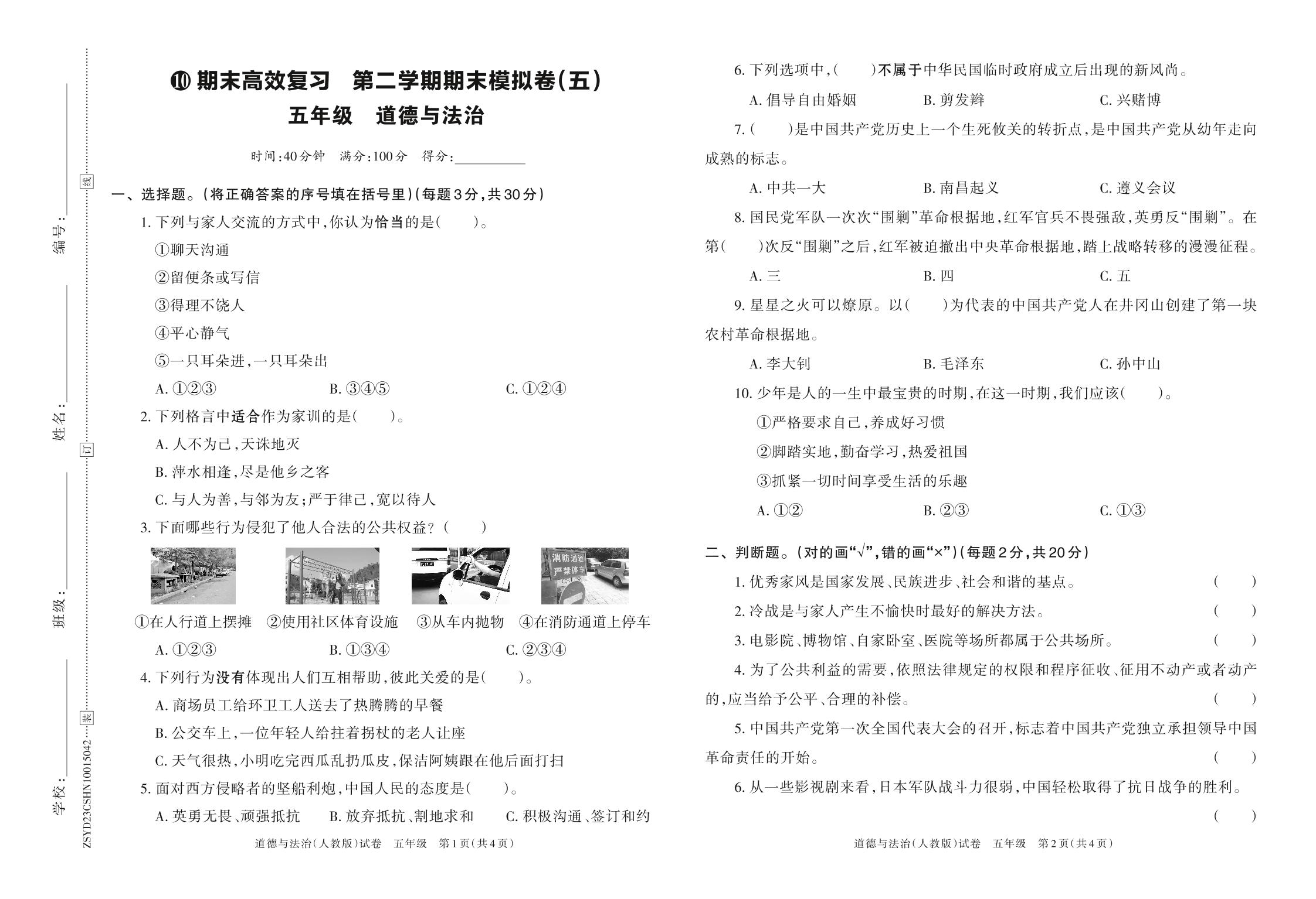 2023年春下册五年级道德与法治人教版 期末高效复习 第二学期期末模拟卷(五)