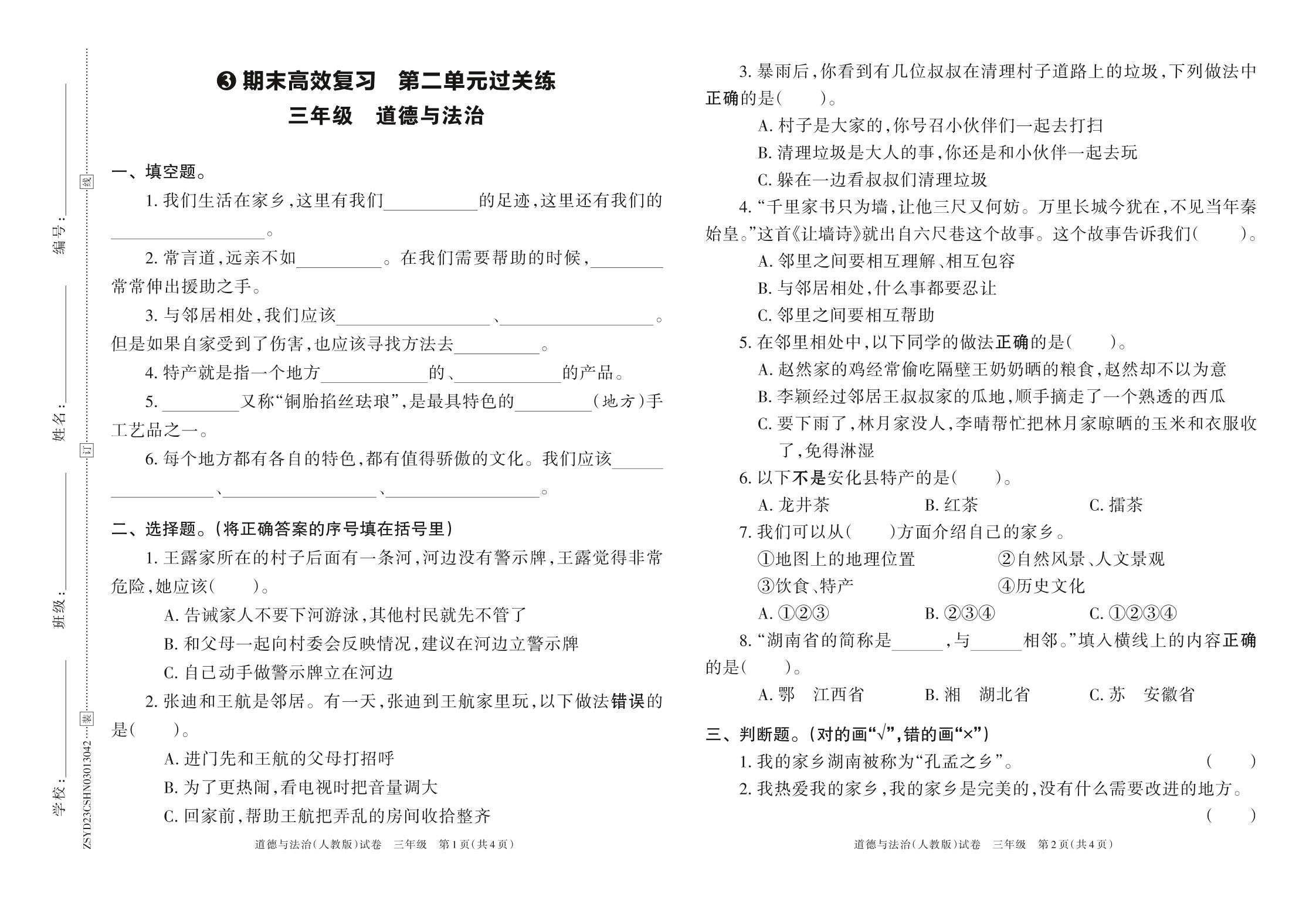 2023年春下册三年级道德与法治人教版 期末高效复习 第二单元过关练