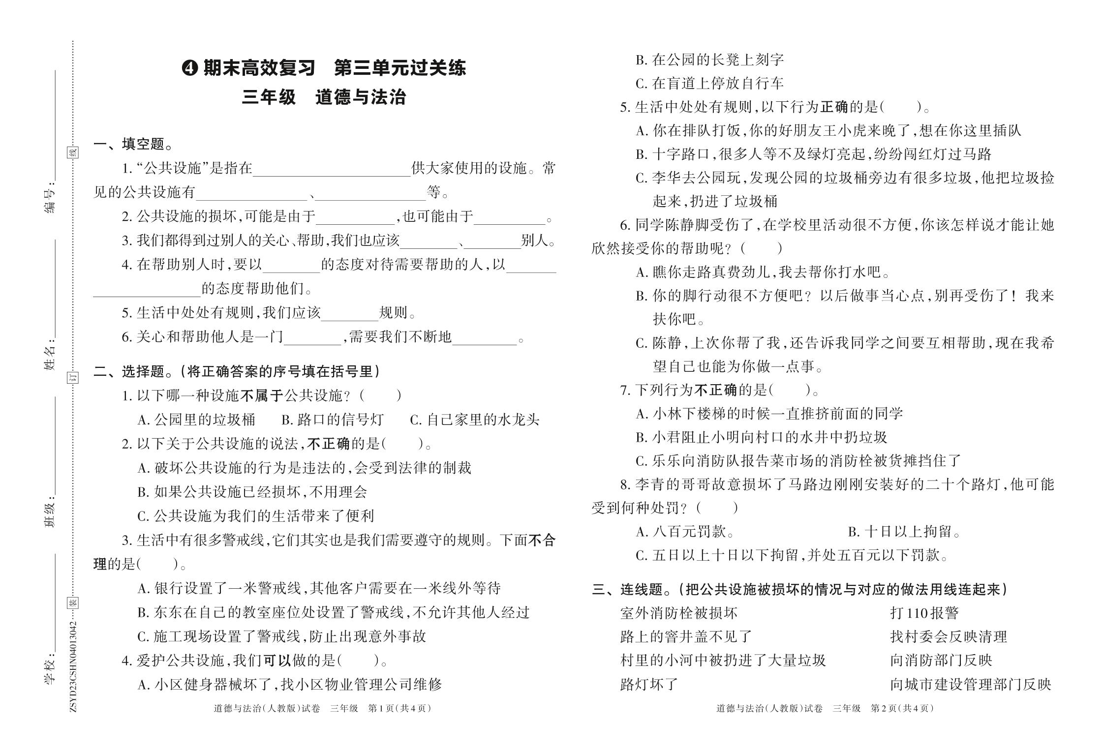 2023年春下册三年级道德与法治人教版 期末高效复习 第三单元过关练