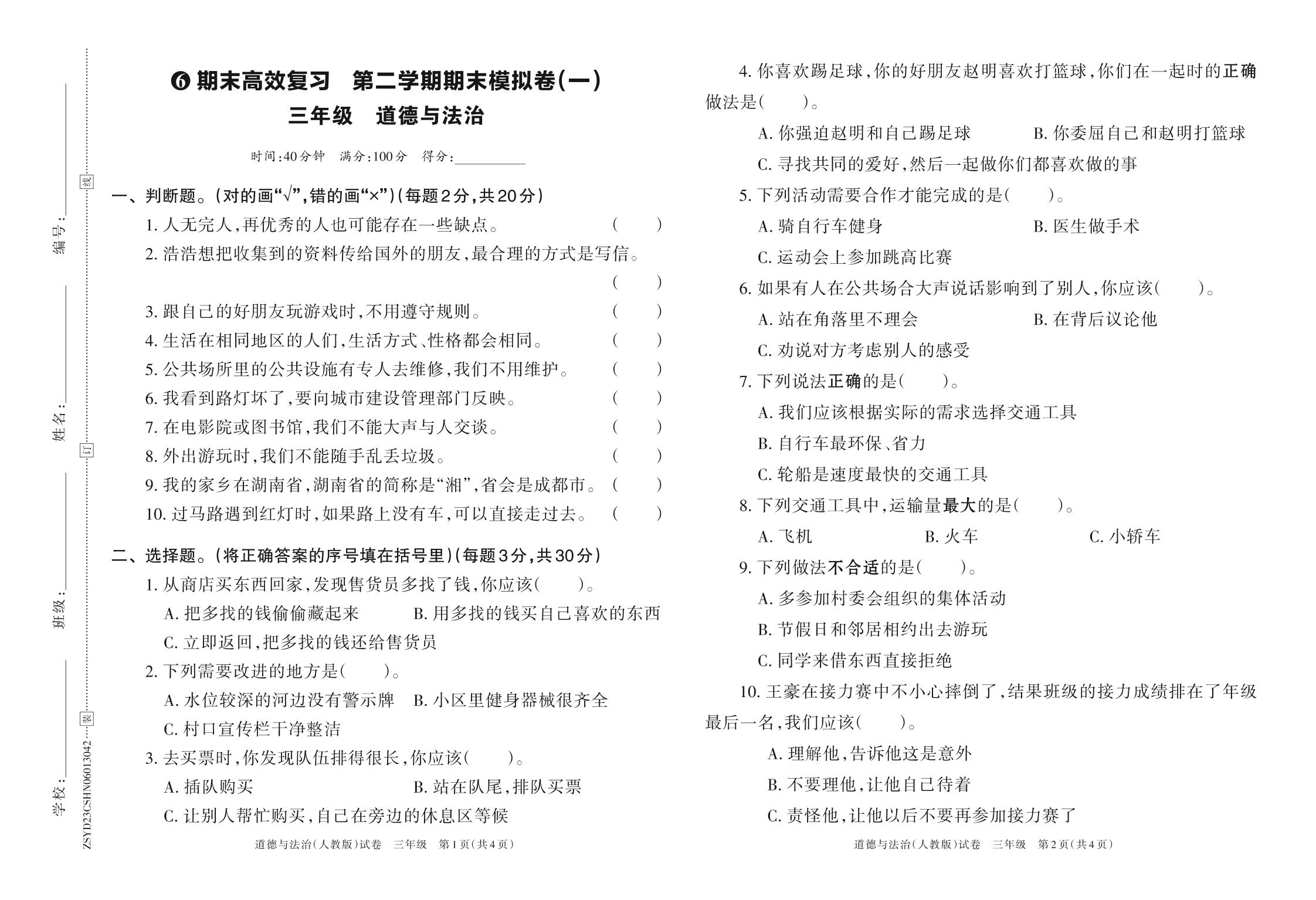 2023年春下册三年级道德与法治人教版 期末高效复习 第二学期期末模拟卷(一)