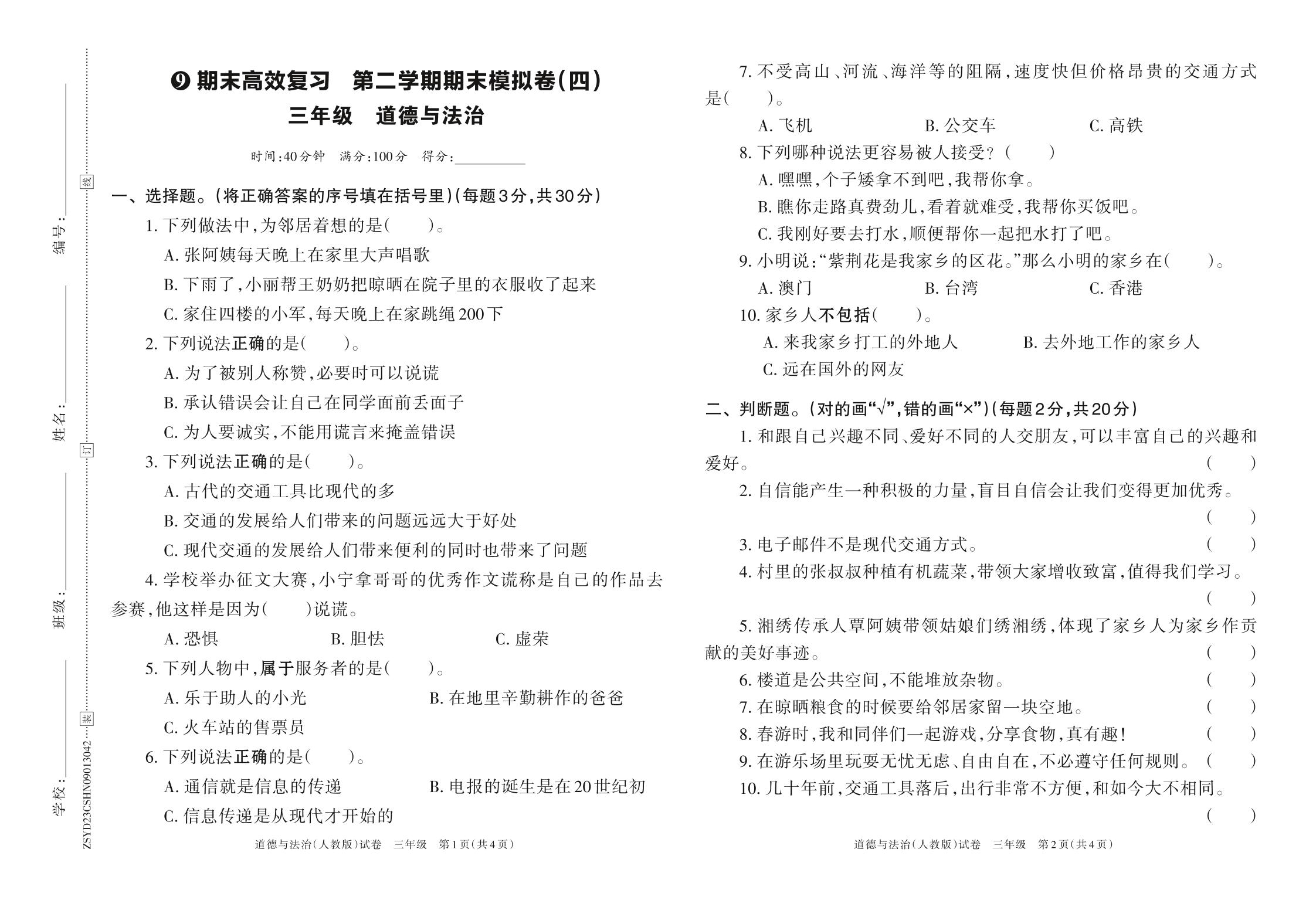 2023年春下册三年级道德与法治人教版 期末高效复习 第二学期期末模拟卷(四)